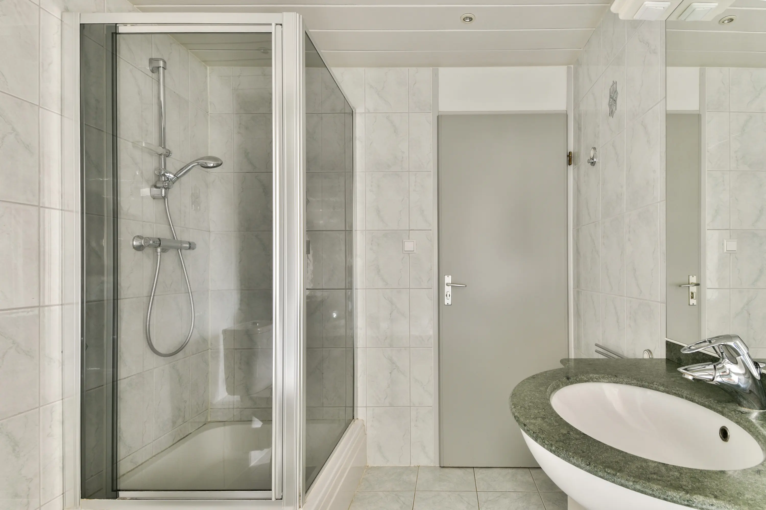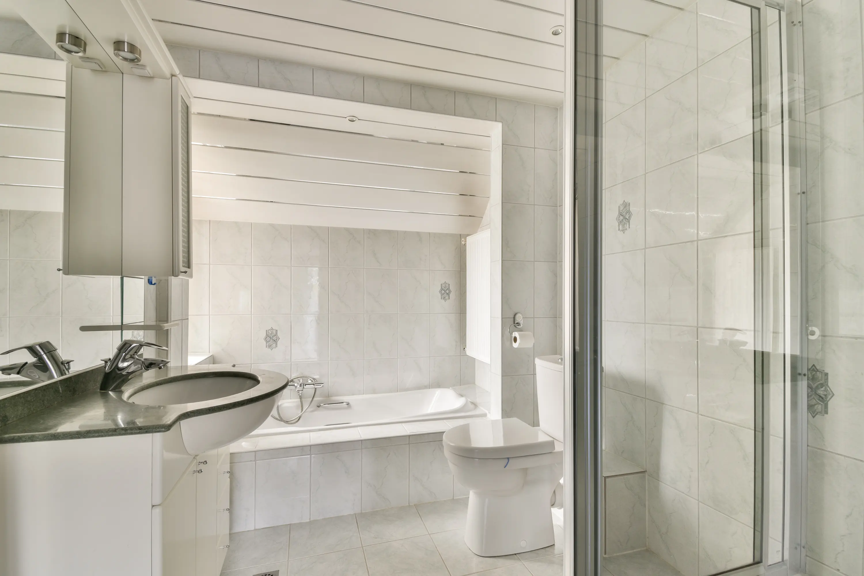 Ruime, geheel betegelde badkamer met lichte wand- en vloertegels. Het geheel is goed onderhouden en ingericht met een ligbad, een aparte douche, een toilet en een wastafelmeubel.