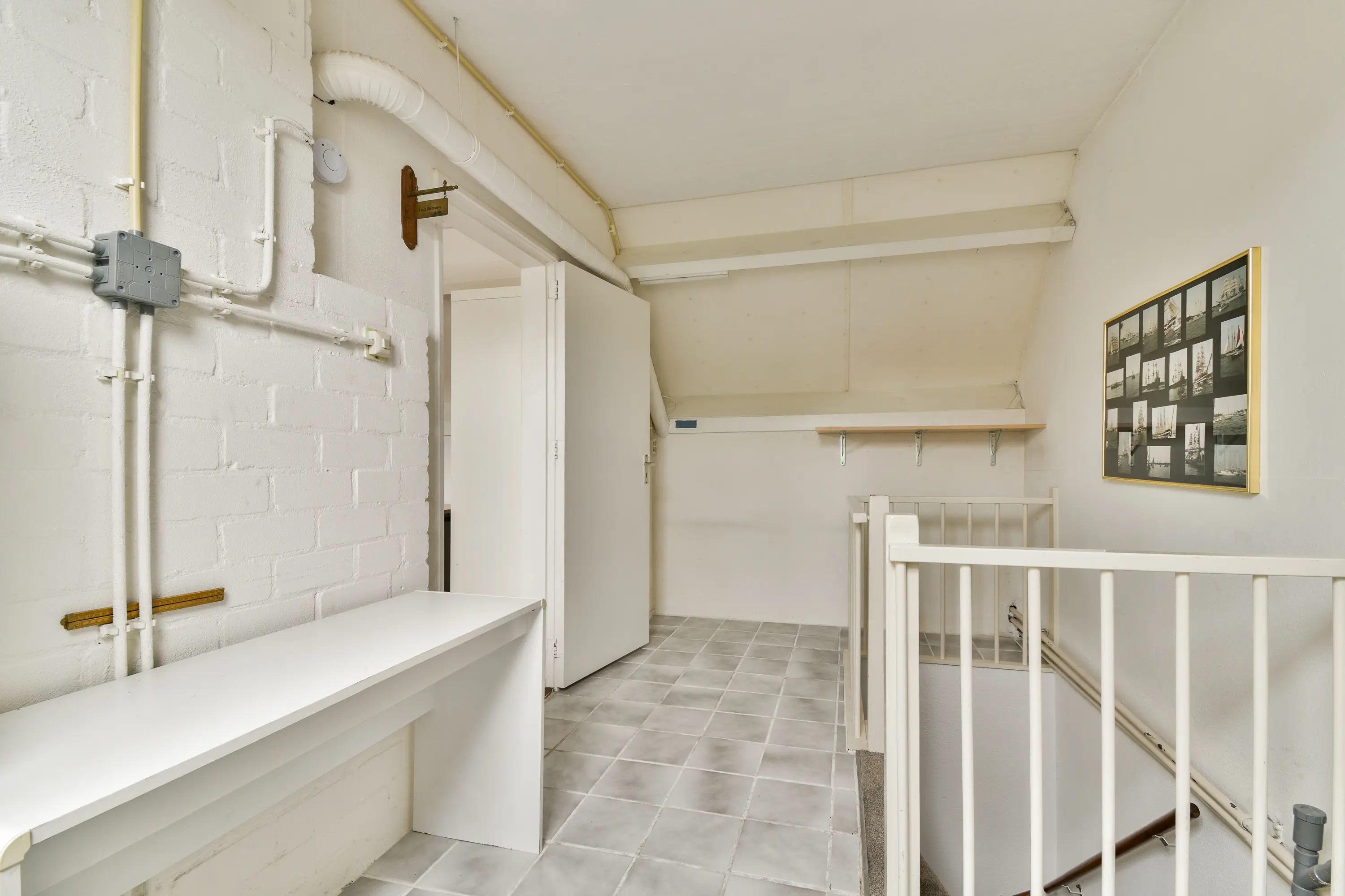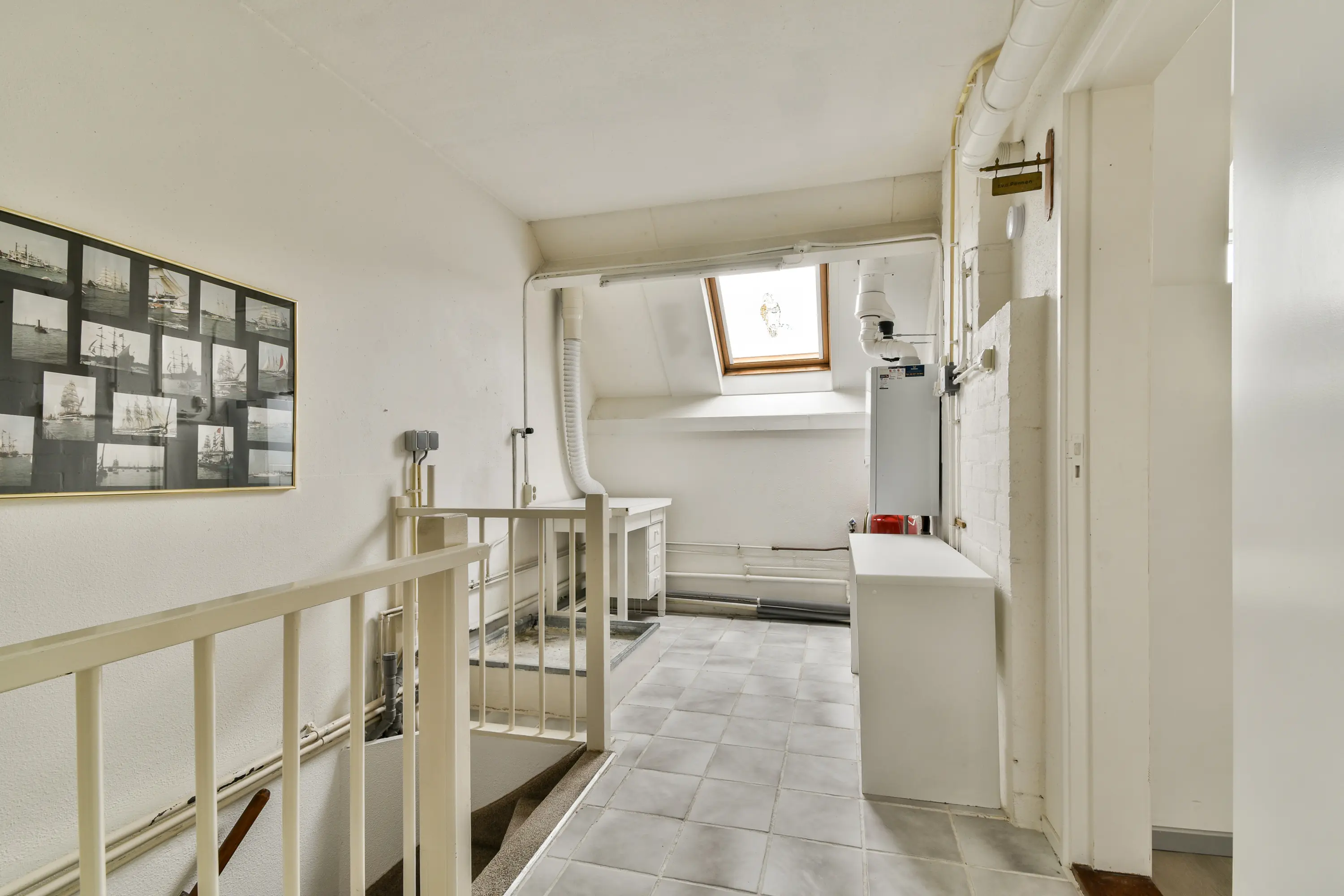 Praktische ruime voorzolder met een dakvenster, aansluiting voor de wasmachine en opstelling van de Cv-ketel.