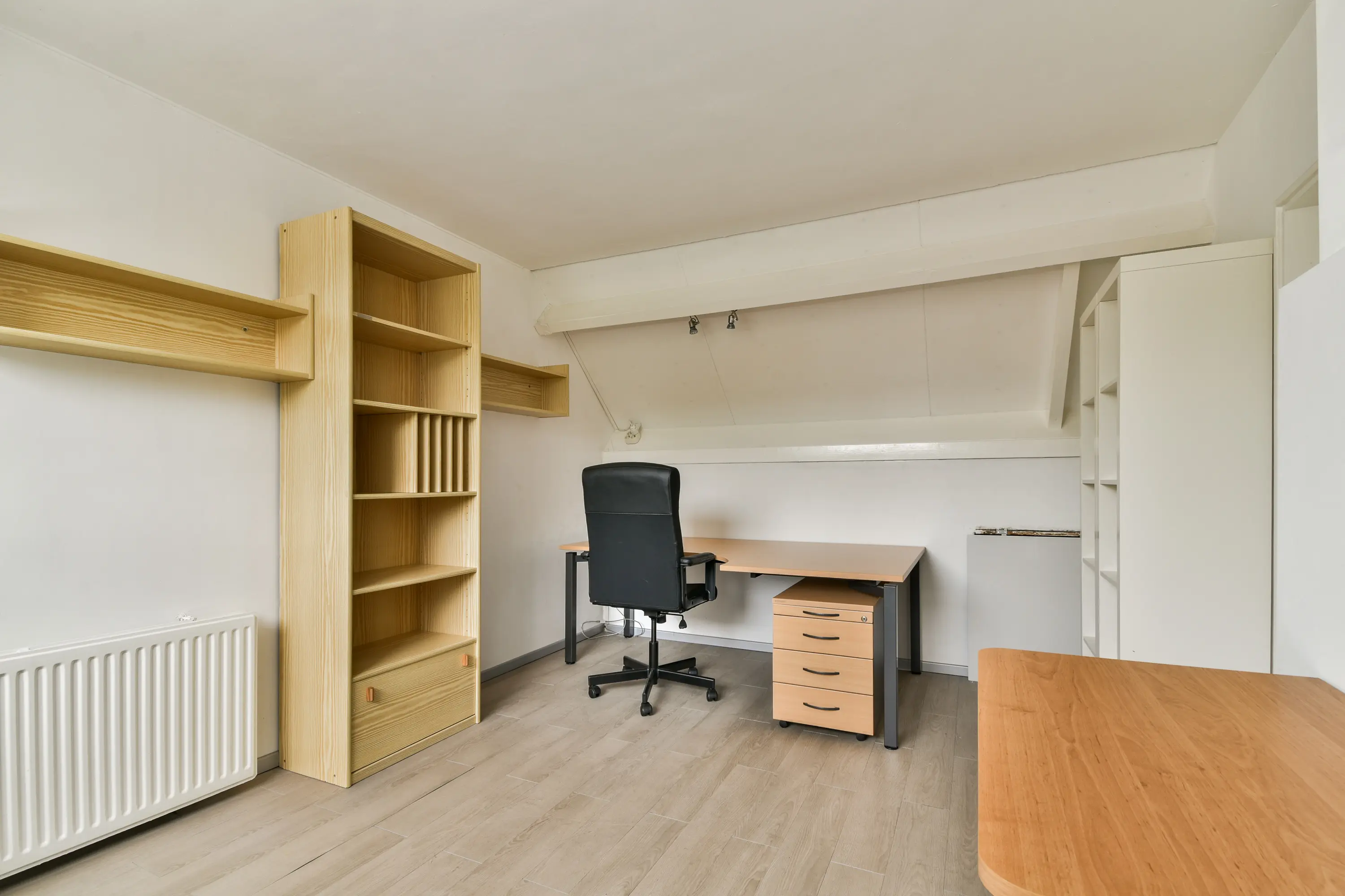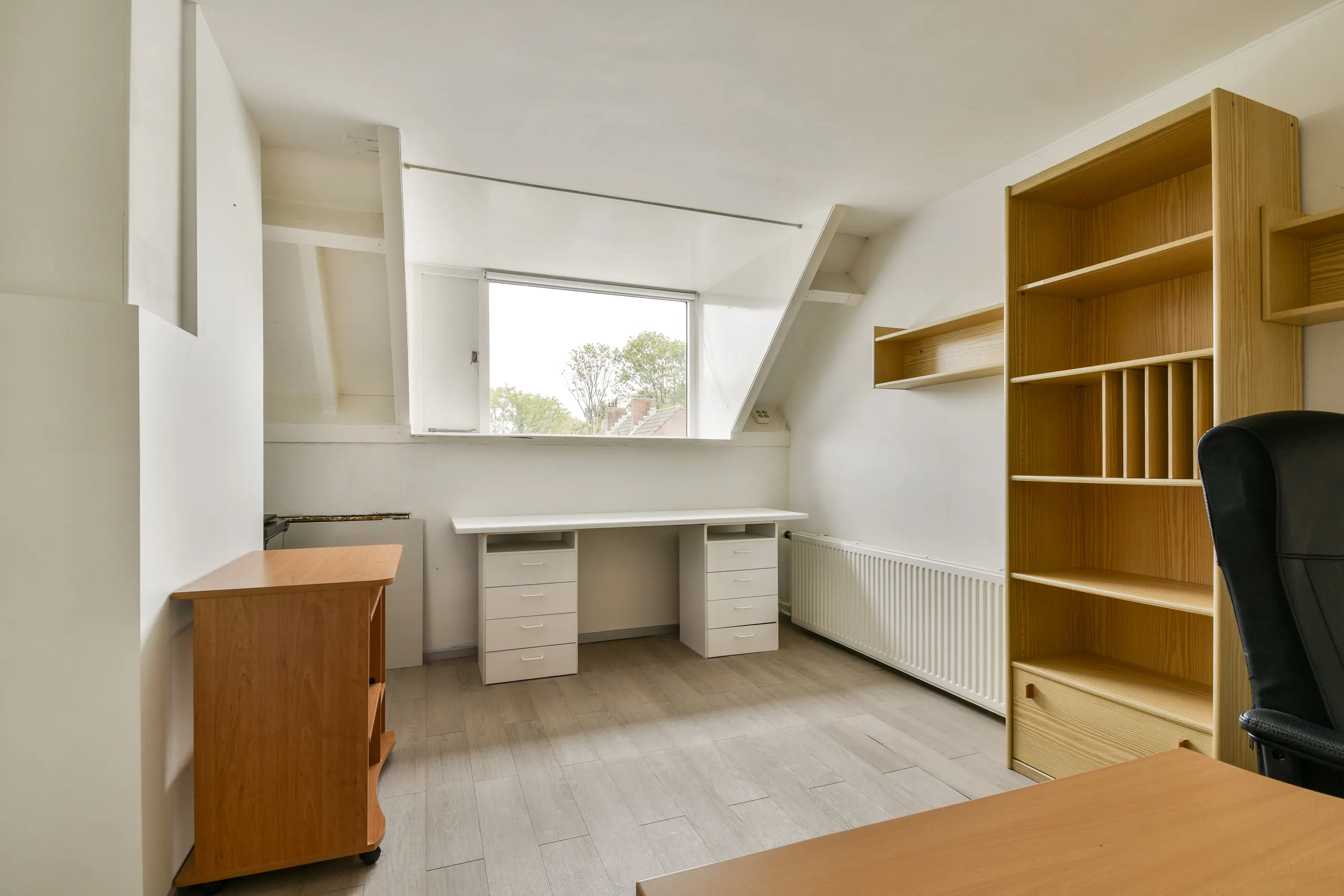 Grote zolderkamer met dakkapel aan de achterzijde. Dankzij de ruime opzet is het mogelijk om hier een extra kamer te creëren. Achter de knieschotten is volop bergruimte aanwezig.