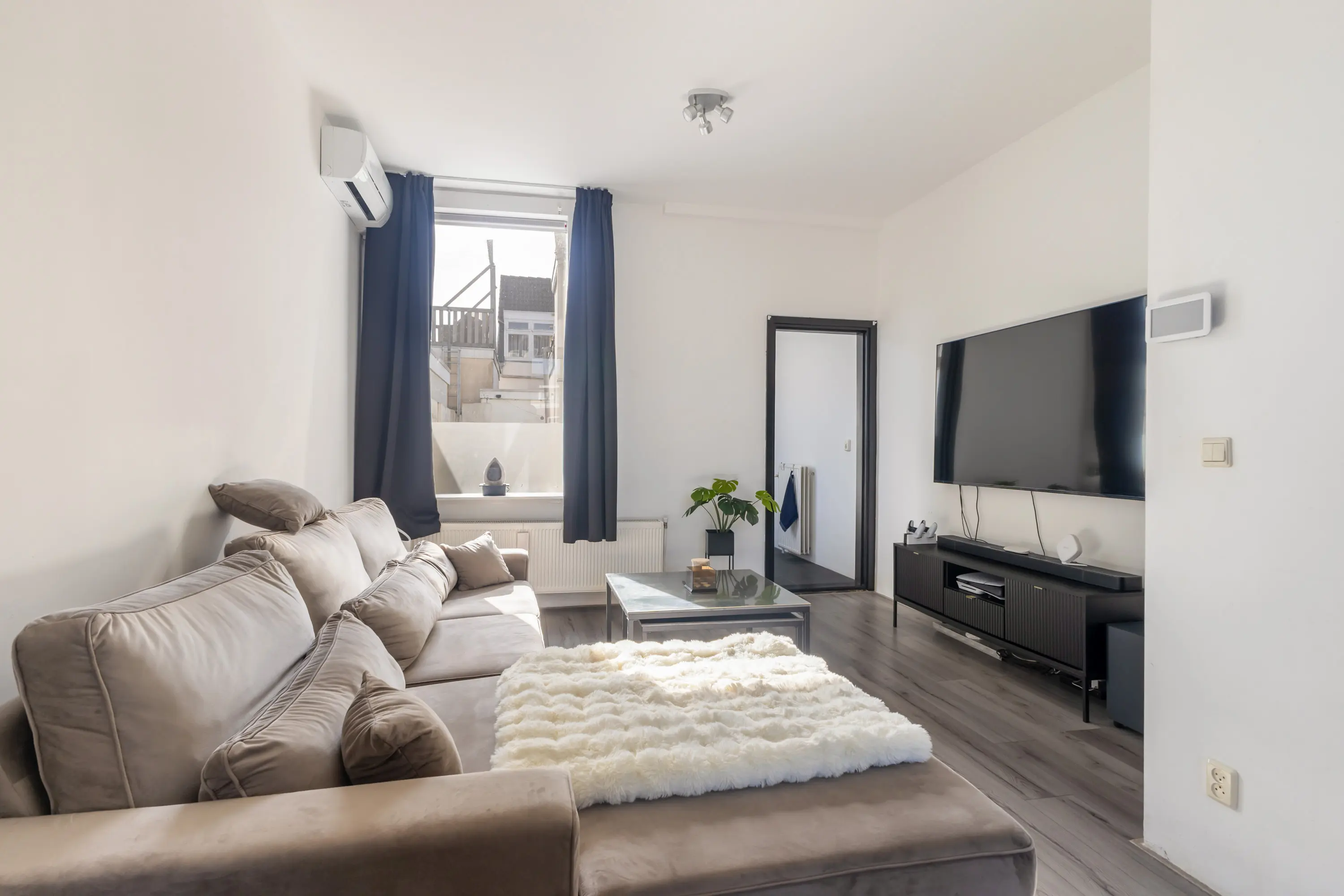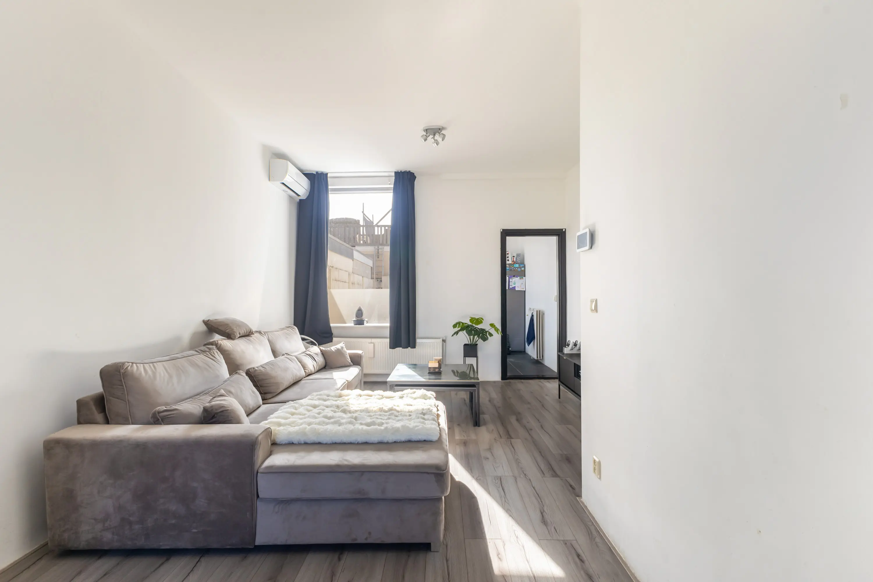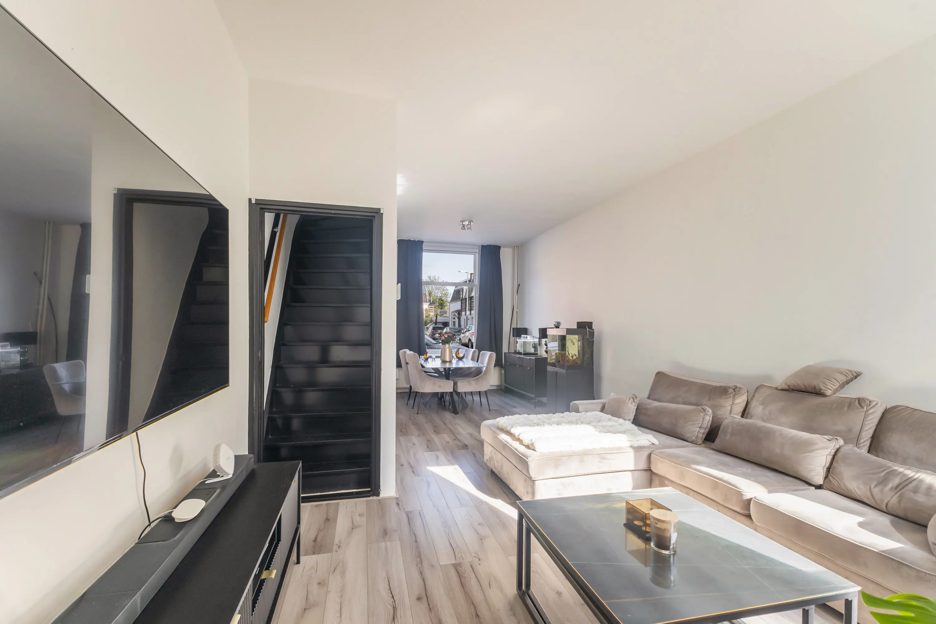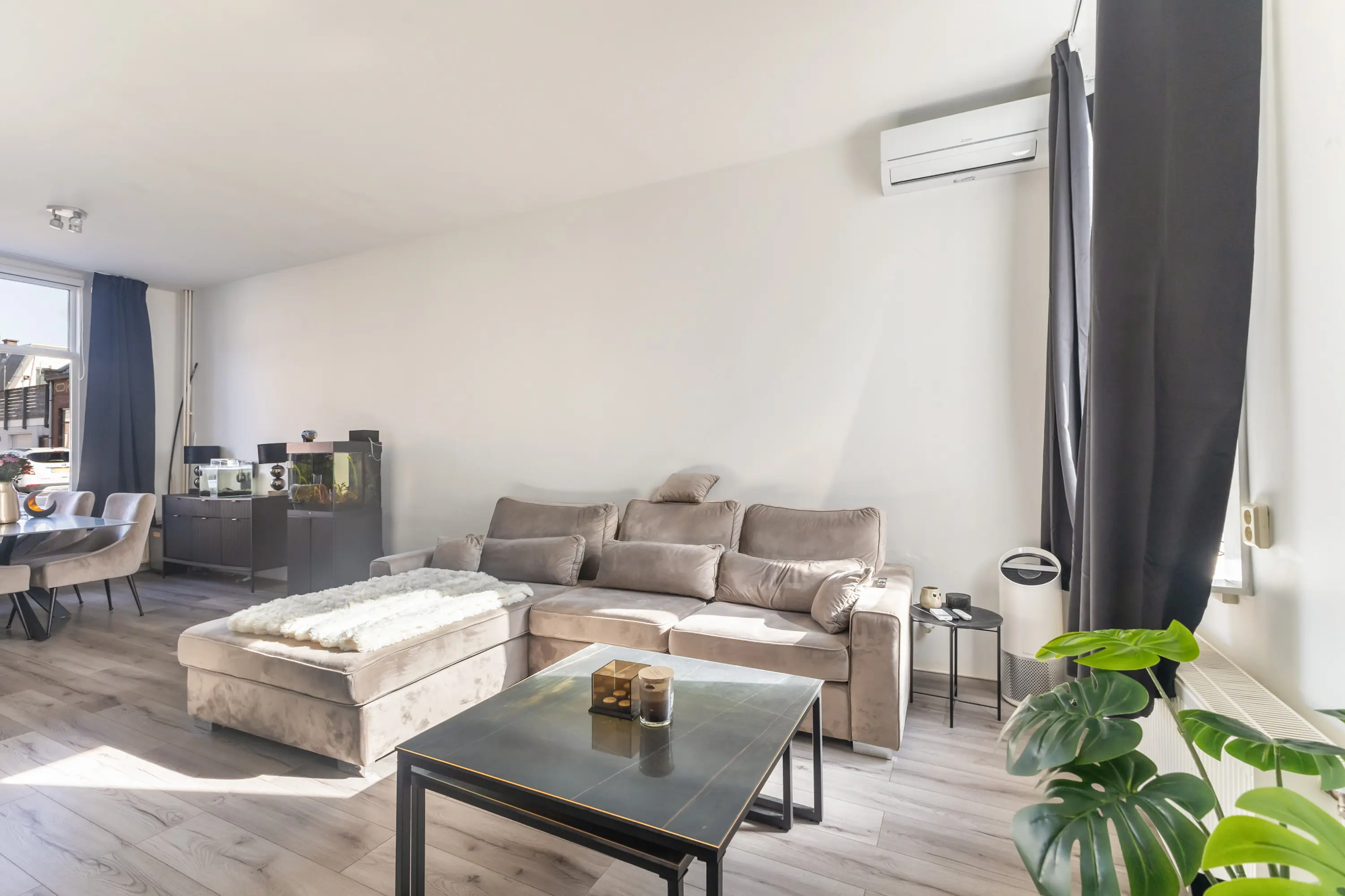 Ruime en lichte woonkamer, waarbij de hoge plafonds zorgen voor een extra ruimtelijk gevoel. Aan de voorzijde bevindt zich het eetgedeelte en aan de achterzijde de comfortabele zithoek, voorzien van airconditioning. Vanuit de woonkamer bereik je zowel de trap naar de eerste verdieping als de keuken.