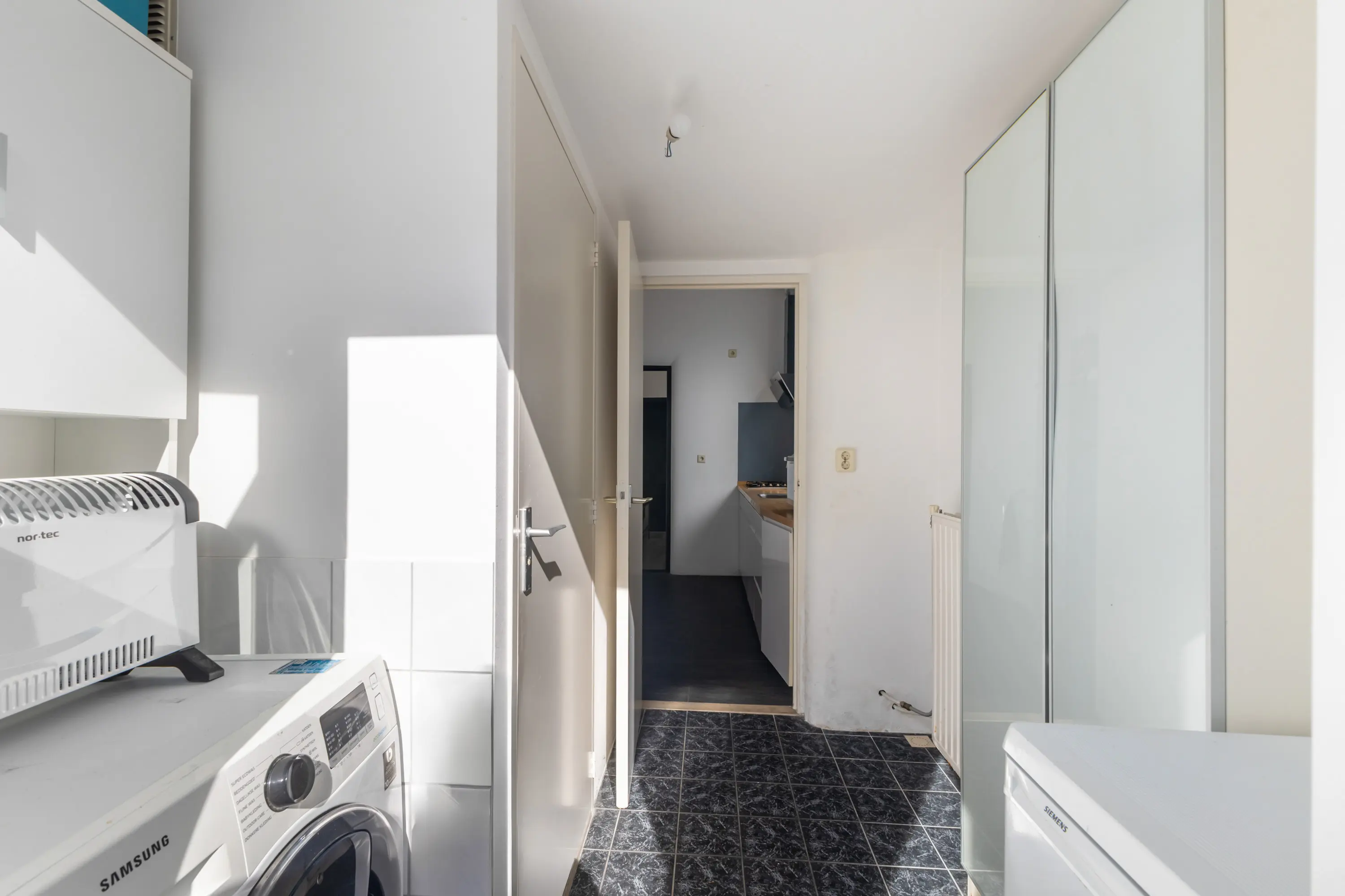 Handige extra ruimte met volop opbergmogelijkheden en de opstelplaats voor de wasmachine. Via een loopdeur is er toegang tot de achtertuin.