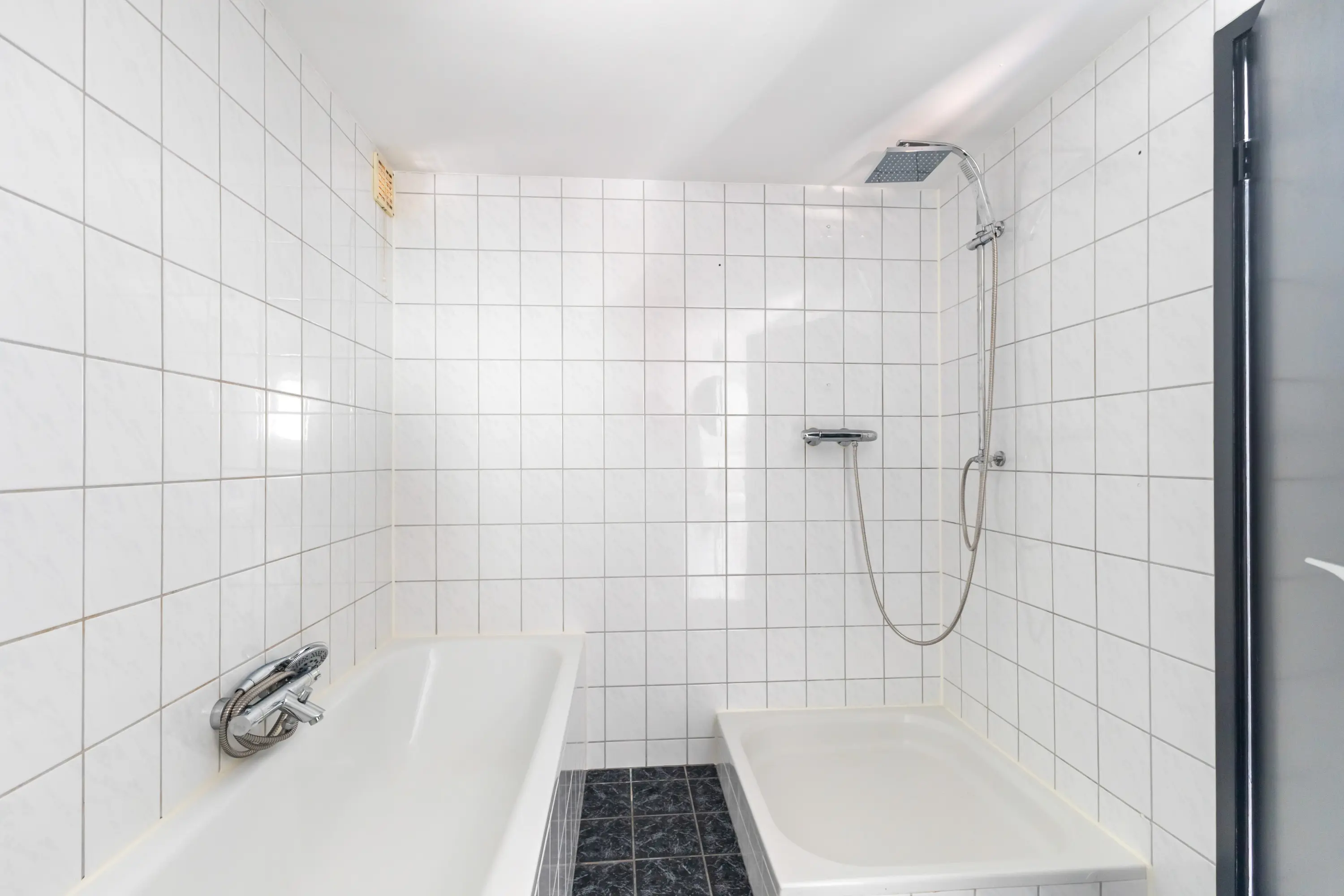 Centraal op de verdieping bevindt zich de verrassend ruime badkamer, compleet ingericht met een ligbad, douche en tweede toilet.