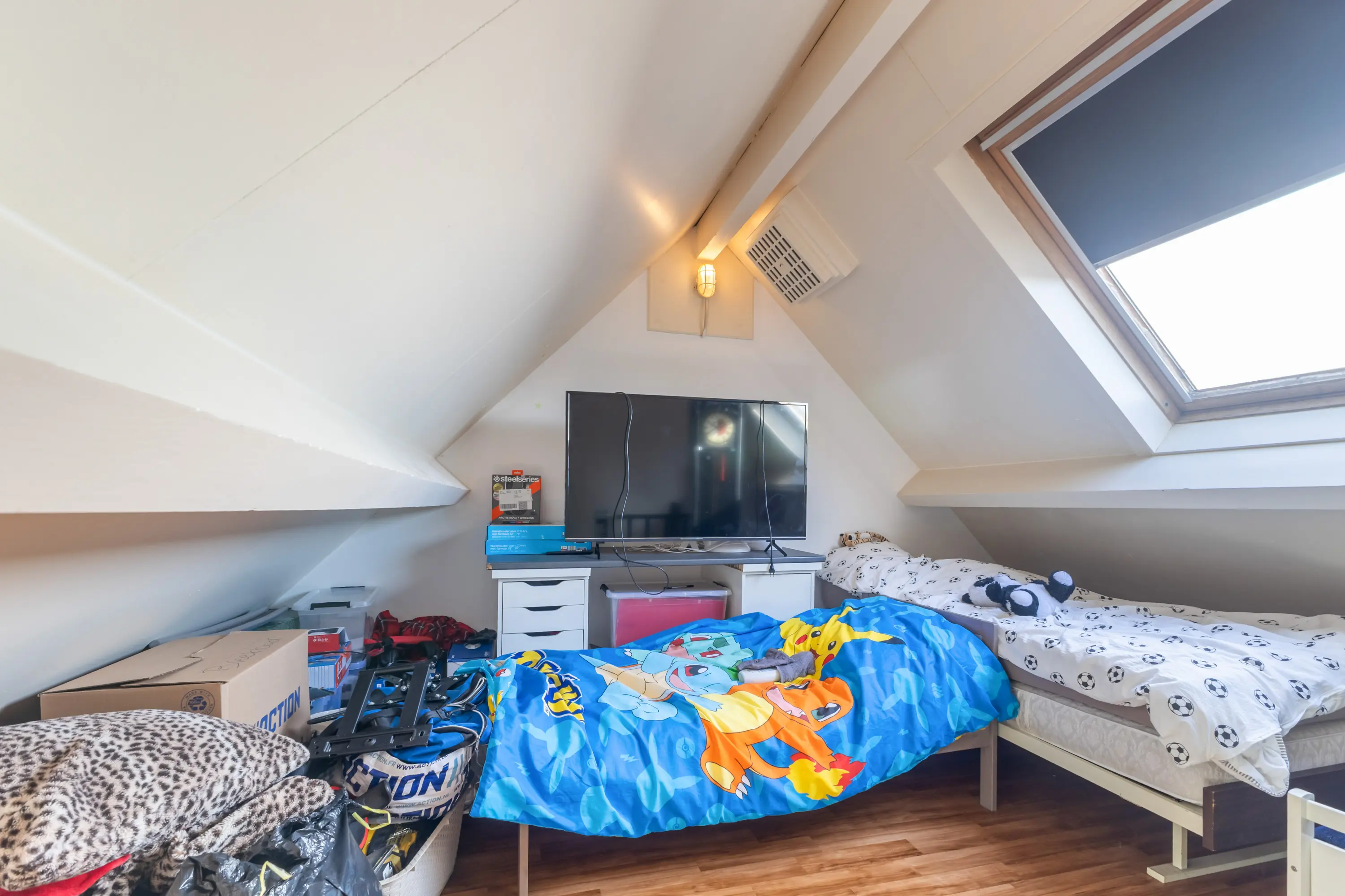 Praktische open ruimte met een groot dakvenster, wat zorgt voor veel lichtinval. Deze verdieping is momenteel ingericht als derde slaapkamer, maar kan ook uitstekend dienen als werk- of hobbyruimte.