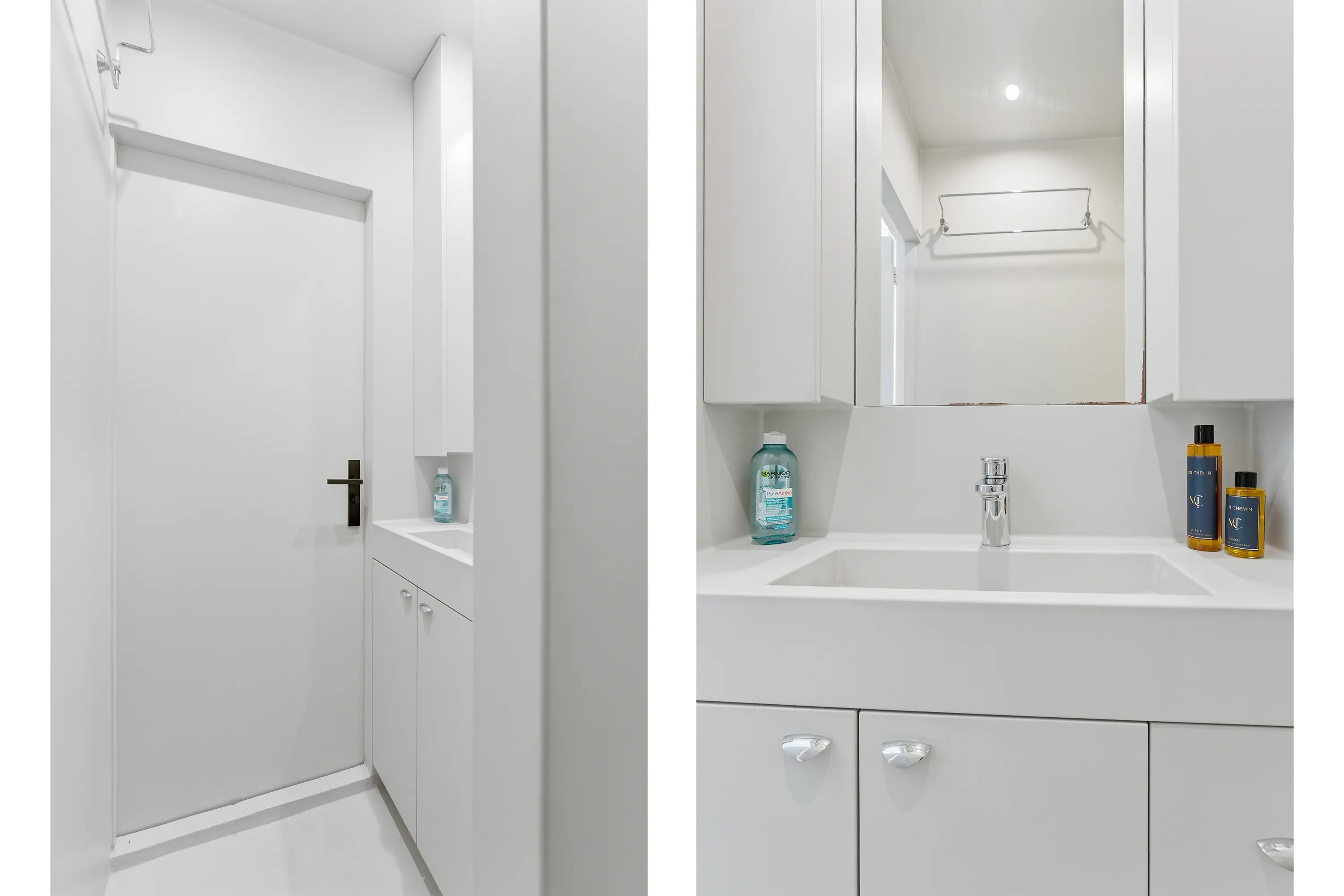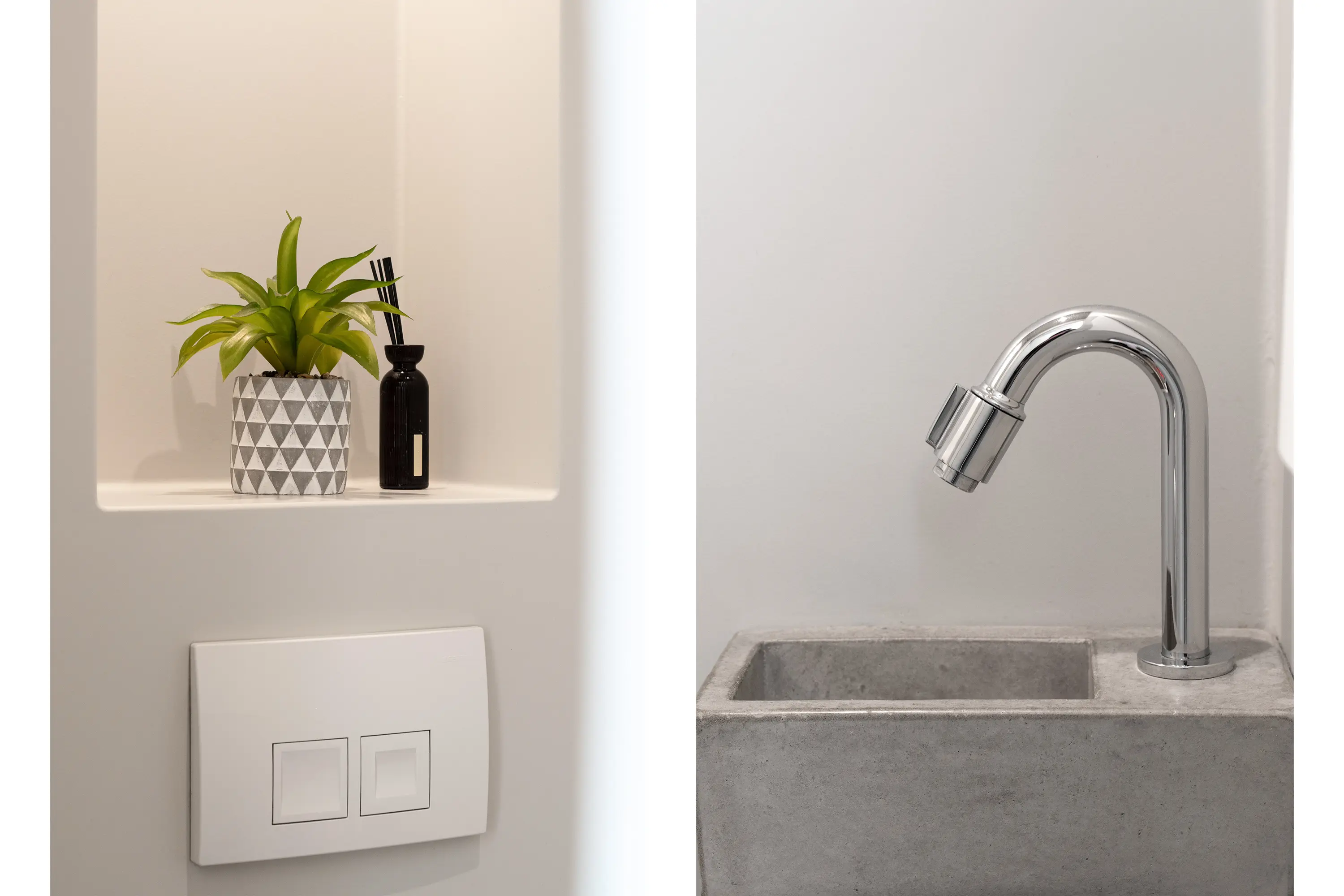 Modern afgewerkt met een wandcloset en een fonteintje.