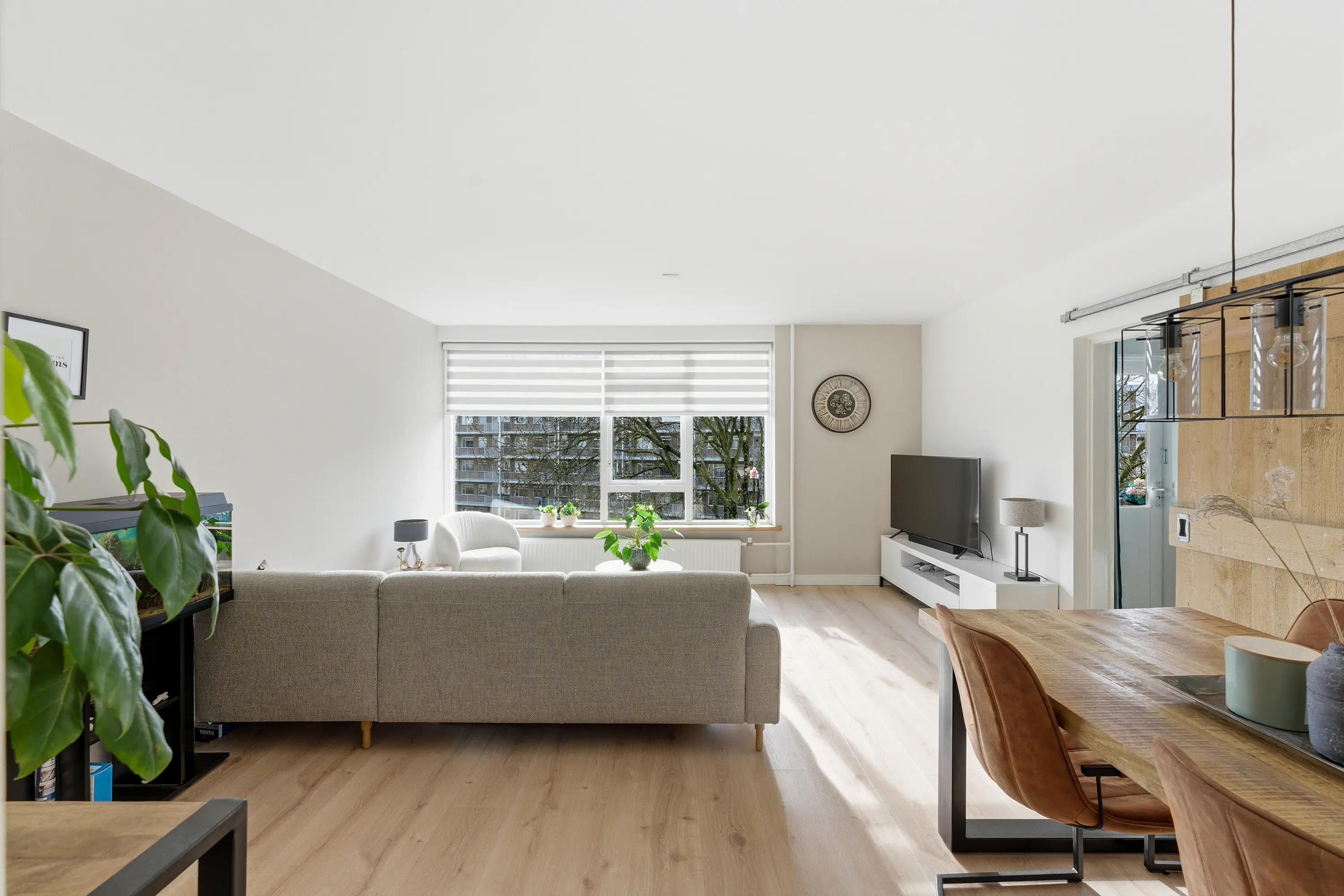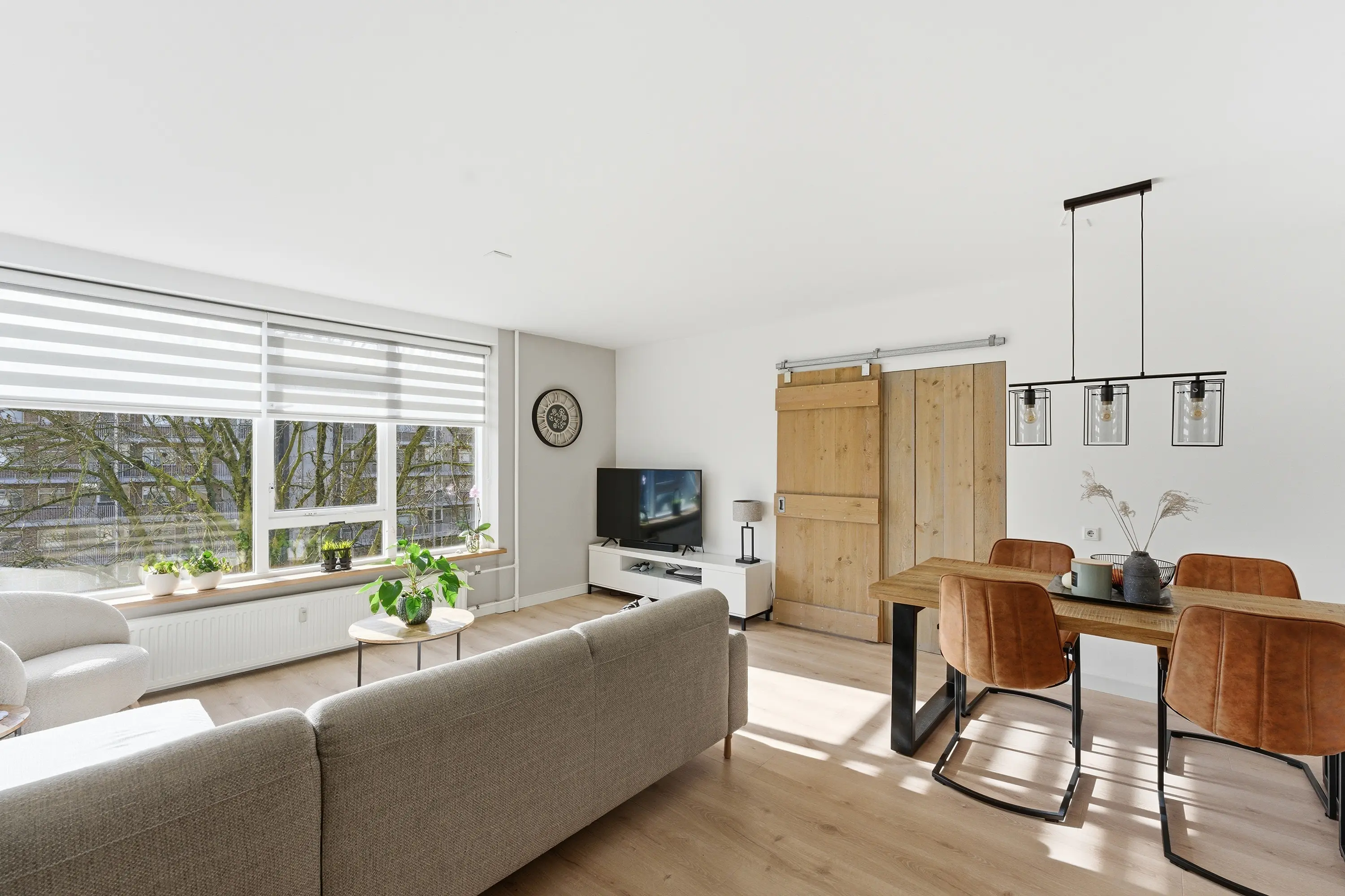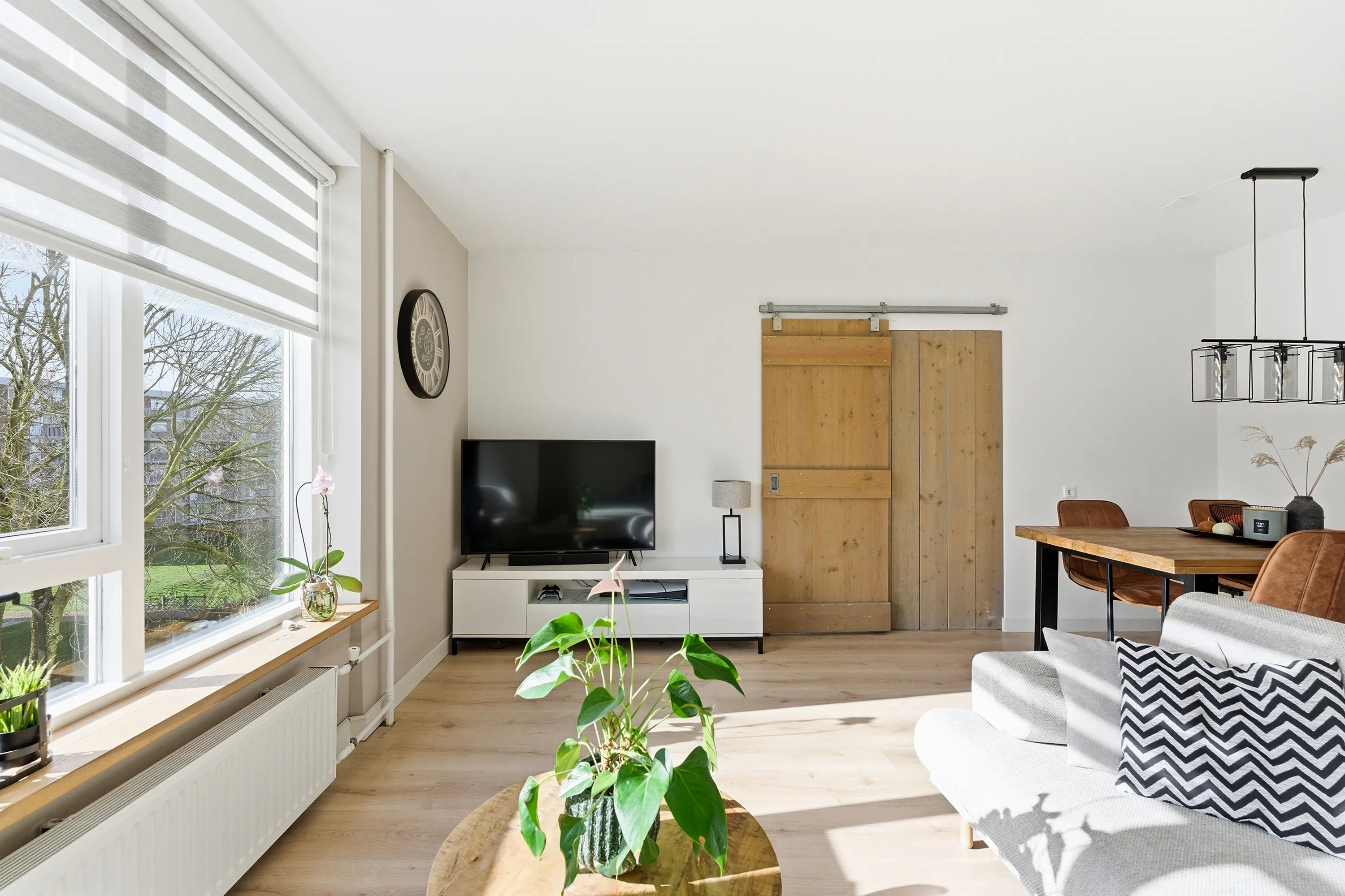 Ruime en lichte woonkamer aan de achterzijde met grote ramen die zorgen voor veel daglicht en een vrij, groen uitzicht. Via een schuifdeur staat de woonkamer in verbinding met de naastgelegen kamer.
