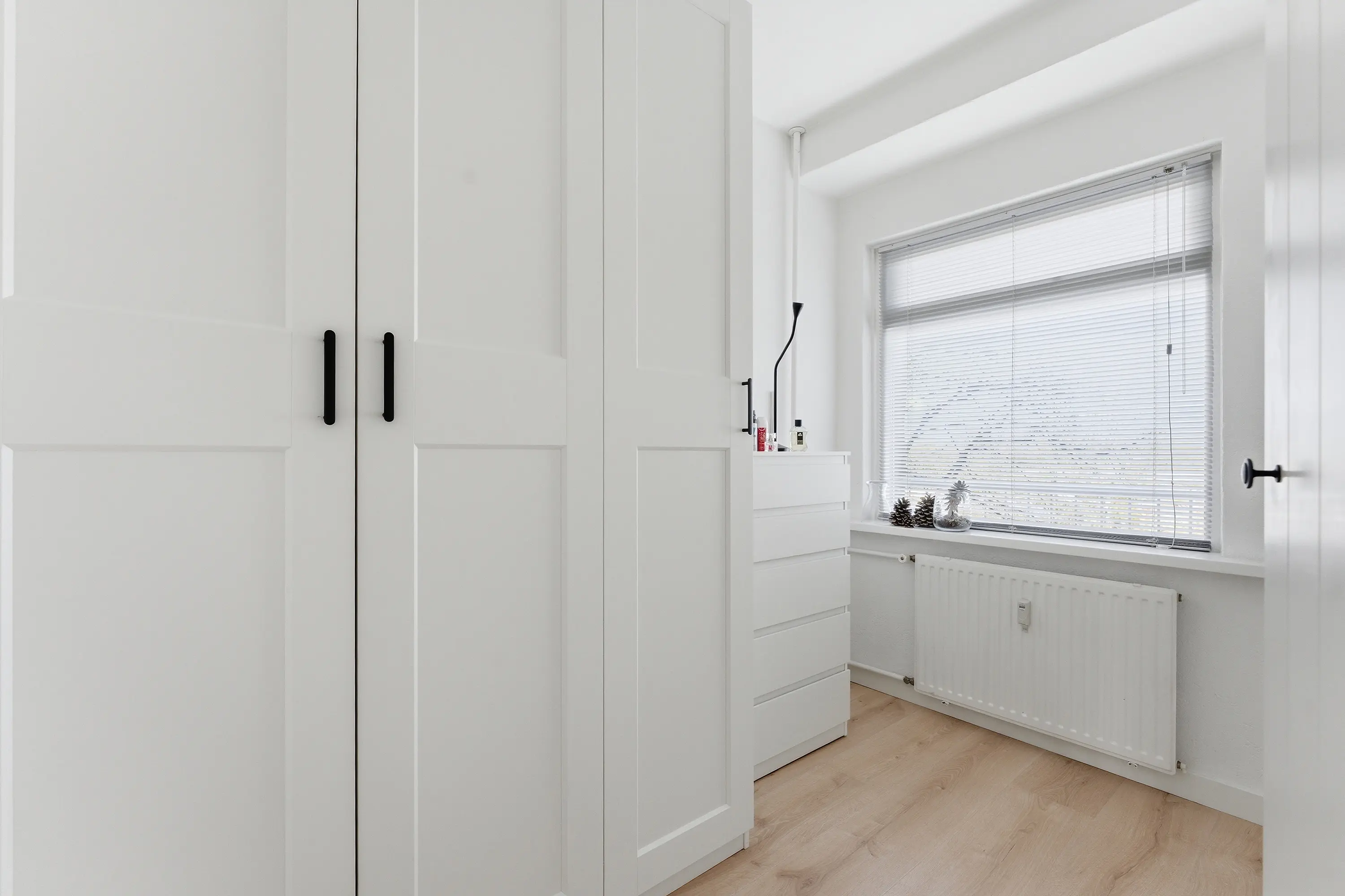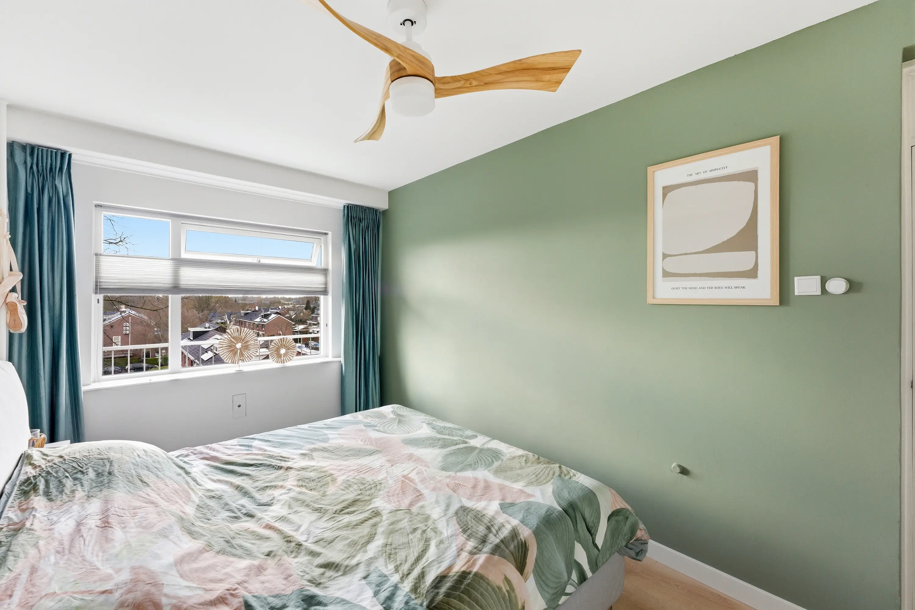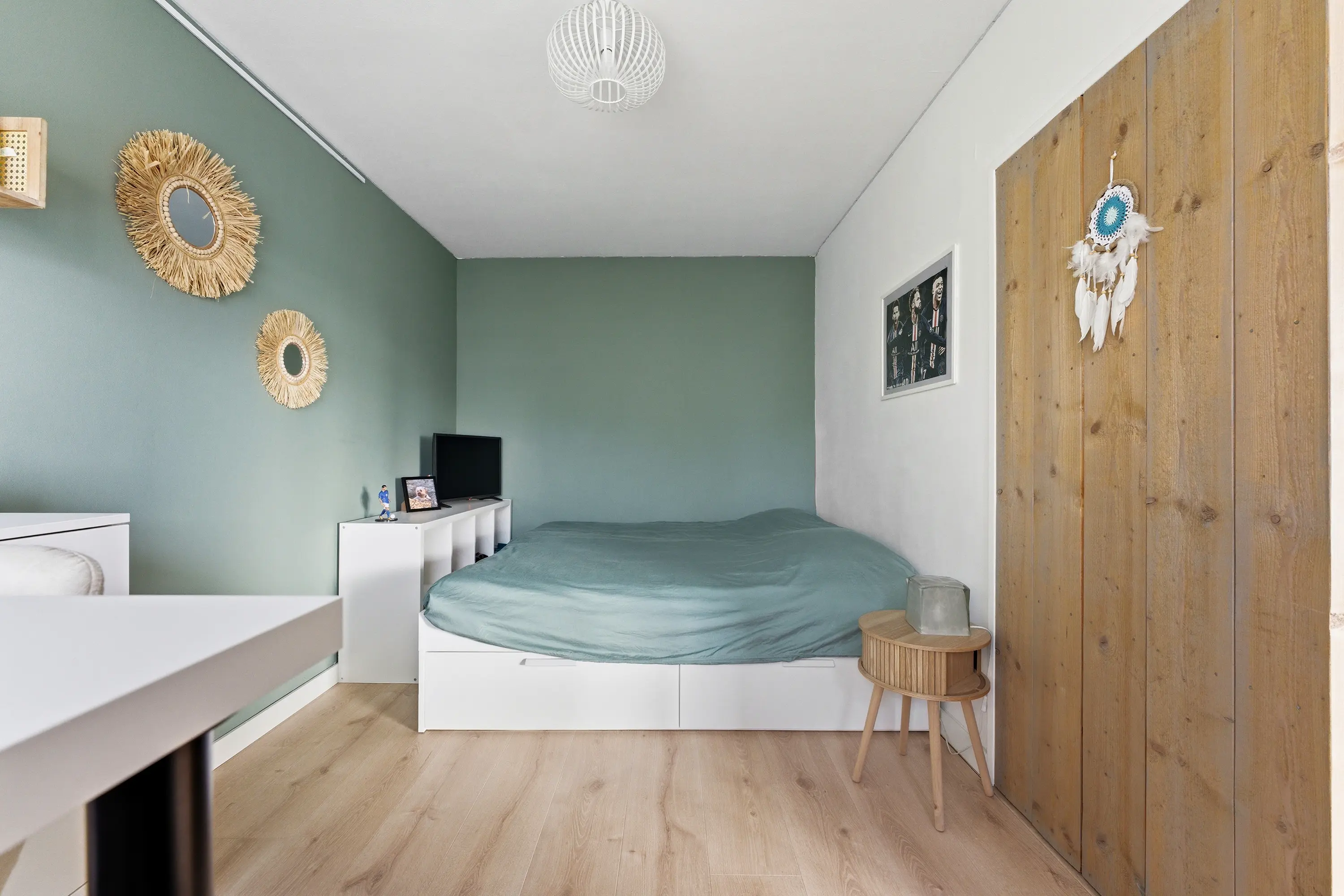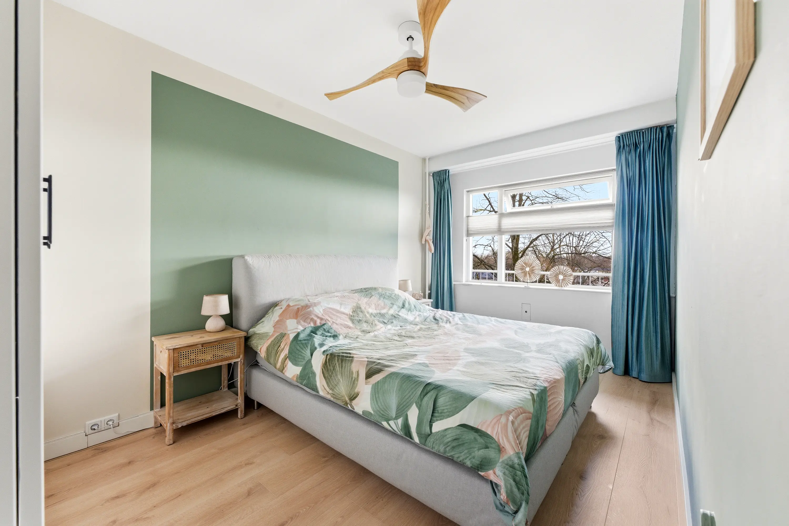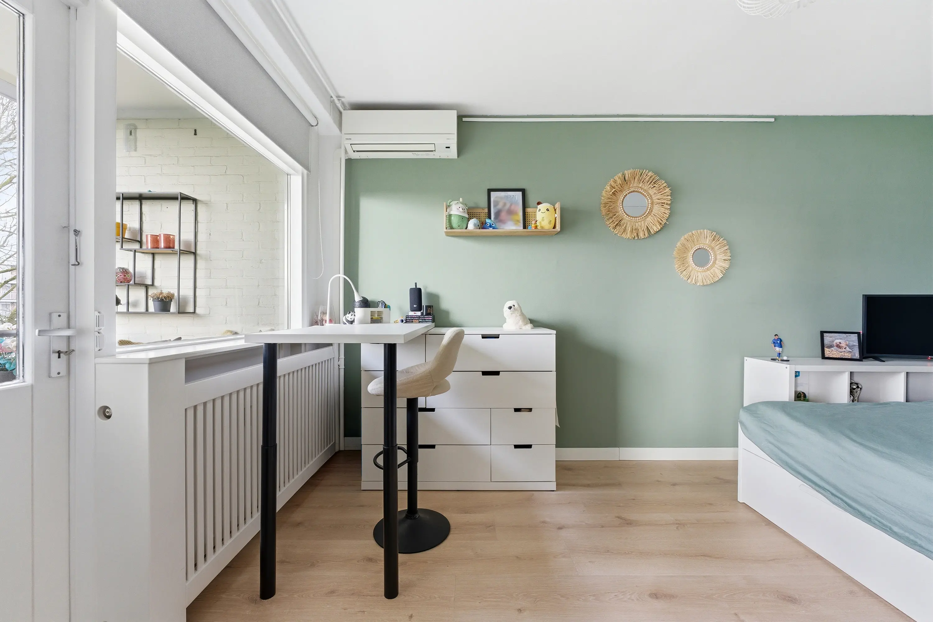 Momenteel ingericht als slaapkamer, maar ook zeer geschikt als eetkamer of thuiskantoor. Vanuit deze kamer is er via een loopdeur toegang tot het balkon met uitzicht over een brede groenstrook en singel. Deze kamer beschikt over een airco.