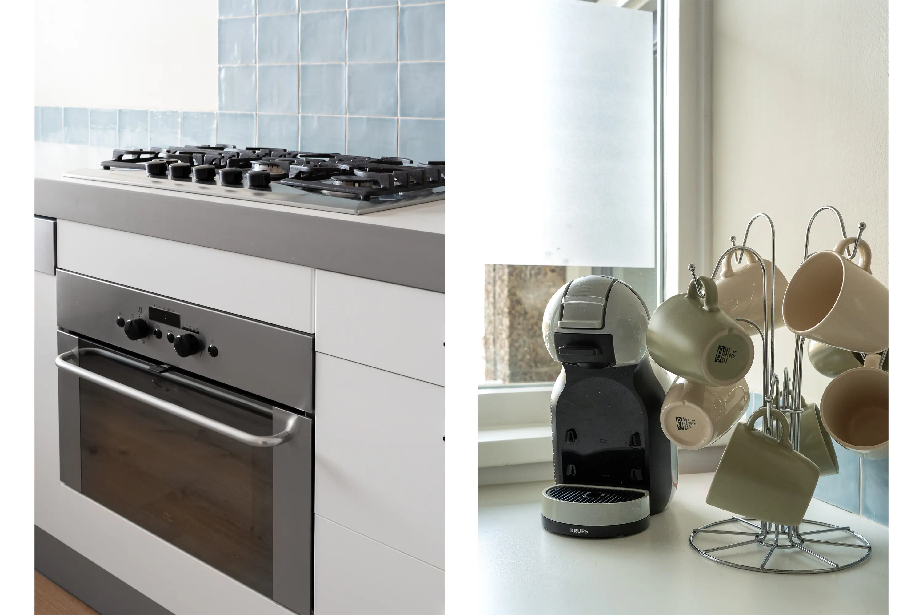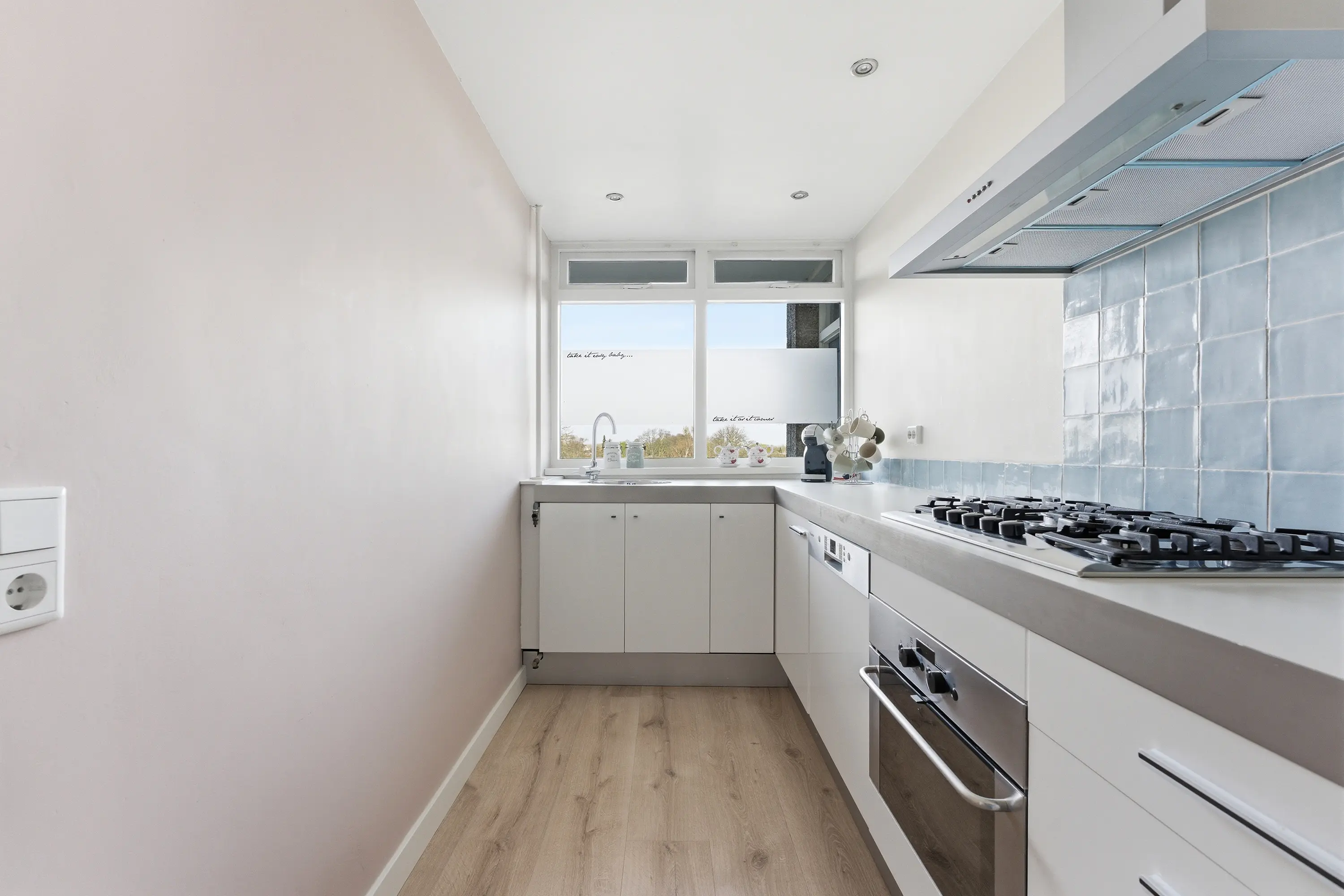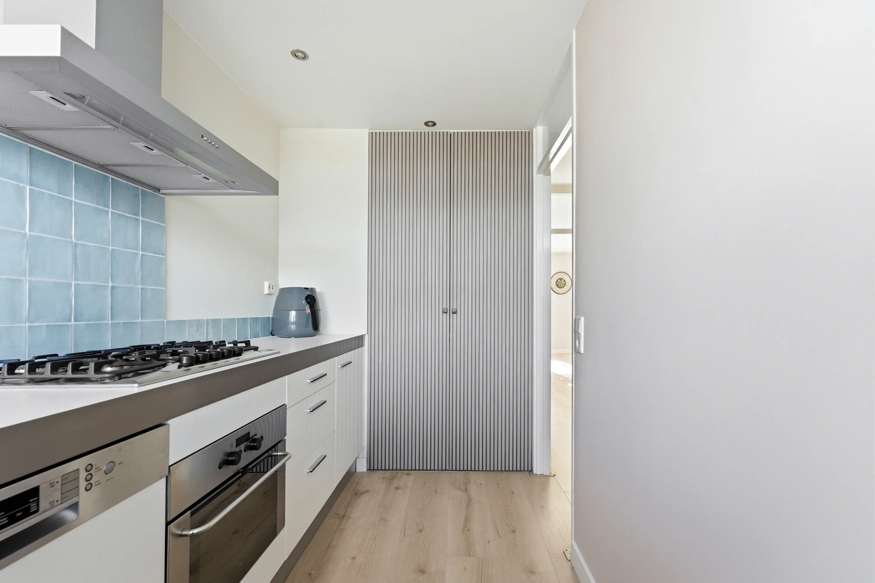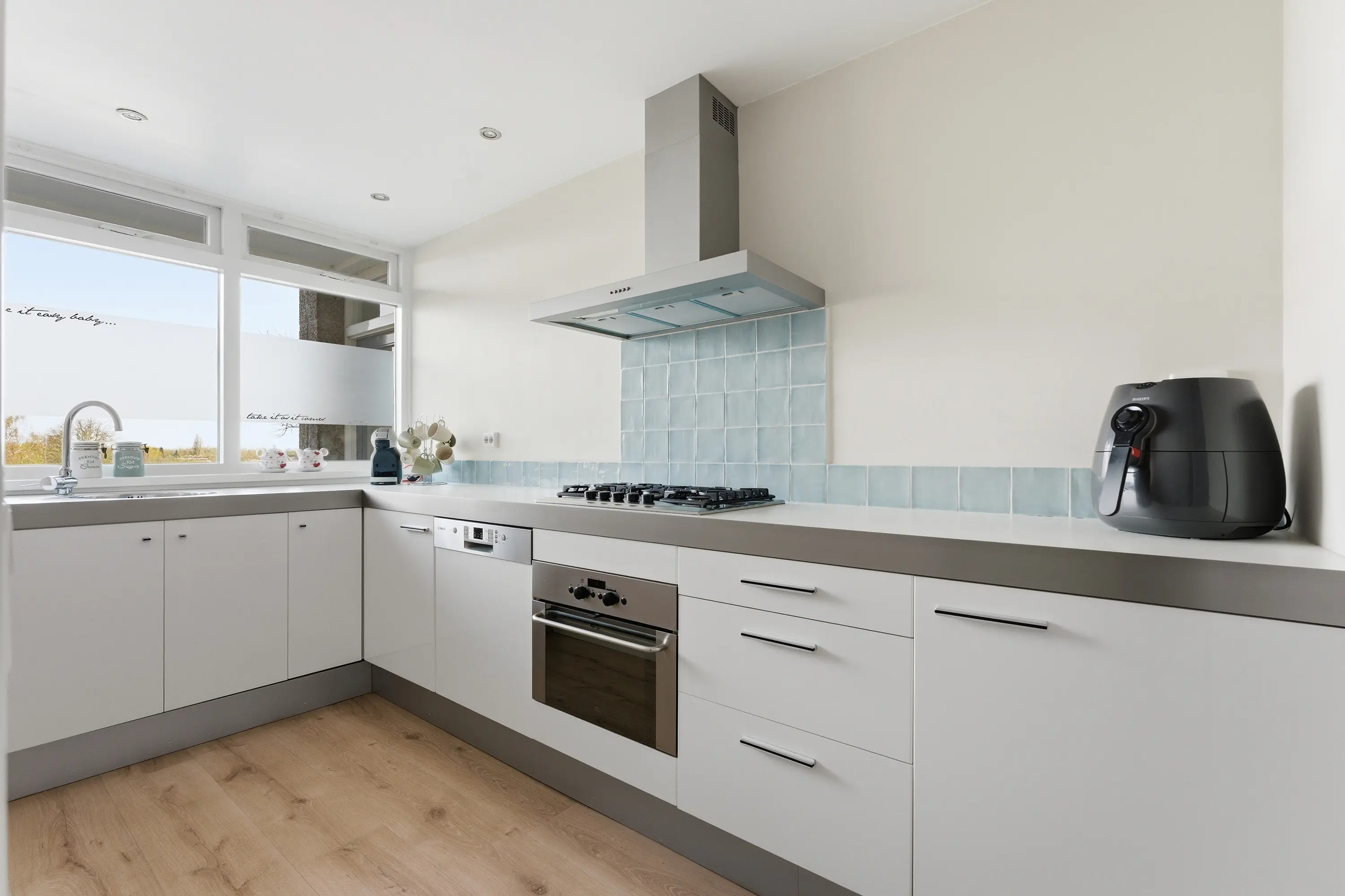 Gelegen aan de voorzijde. Moderne L-vormige inbouwkeuken voorzien van diverse boven- en onderkasten, laden, koelkast, 5-pits gaskookplaat (met wokbrander), circulatiekap, combioven en vaatwasser. Daarnaast beschikt de keuken over een praktische inbouwkast met opstelplaats voor de wasmachine, de droger en de boiler.