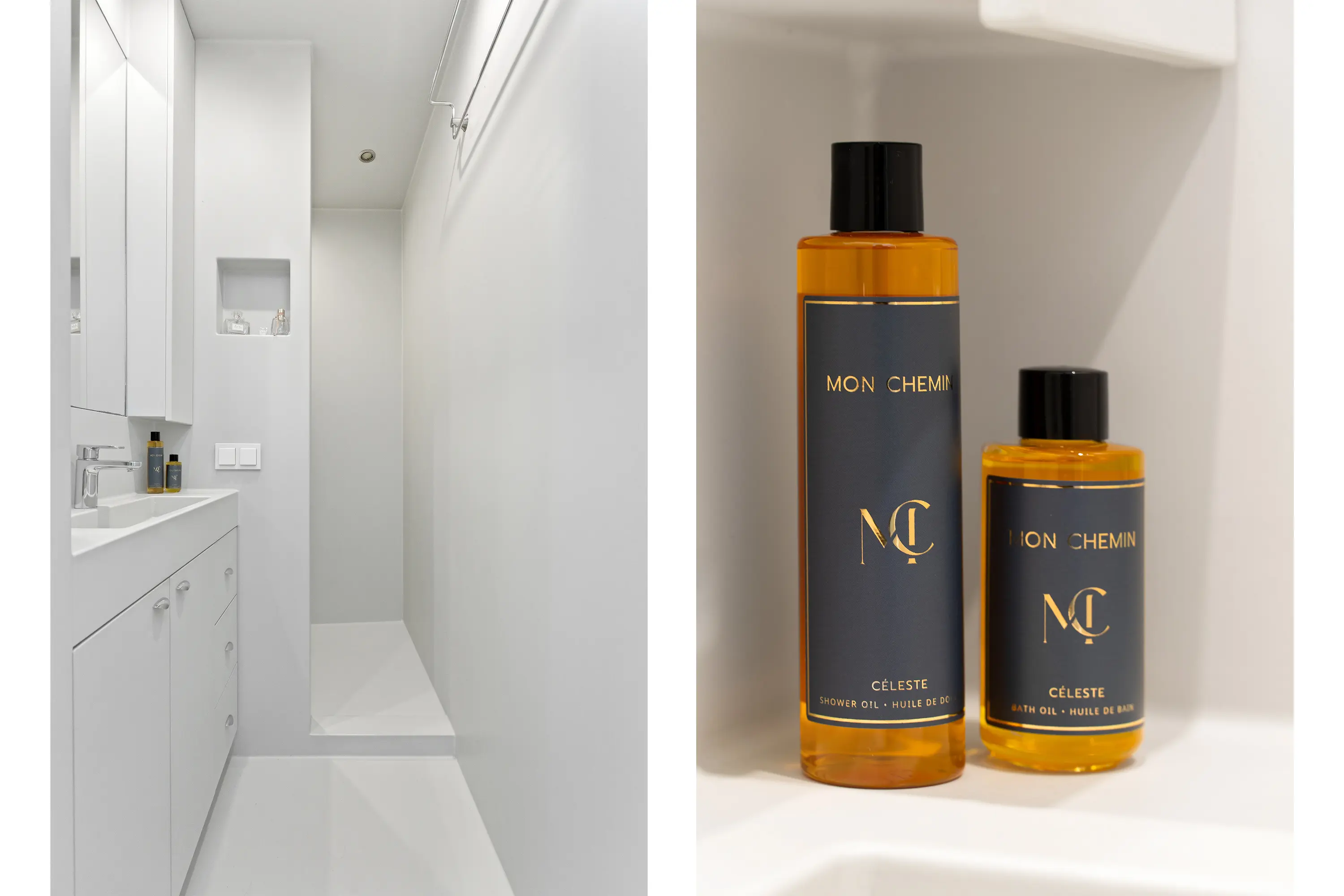 Modern uitgevoerd en voorzien van een douche en een wastafelmeubel.