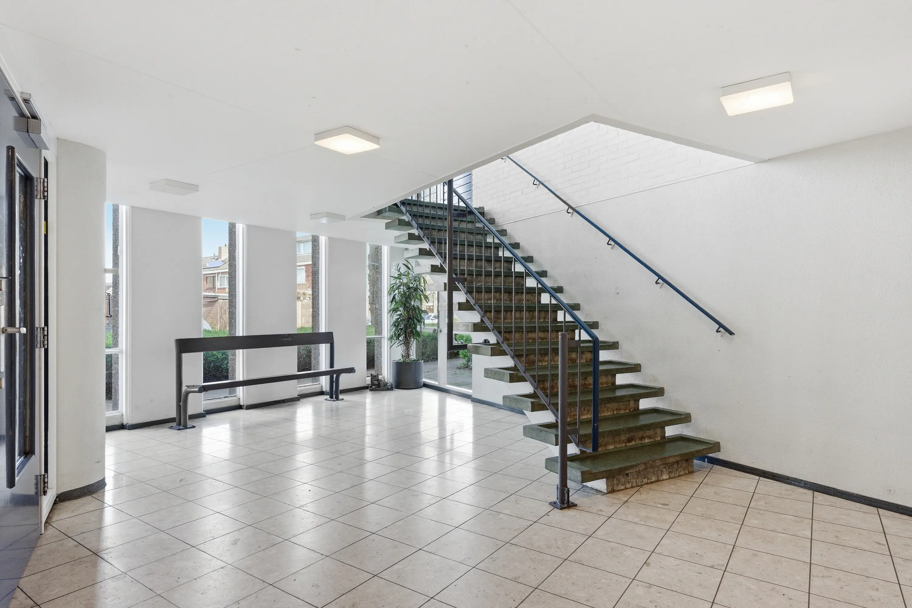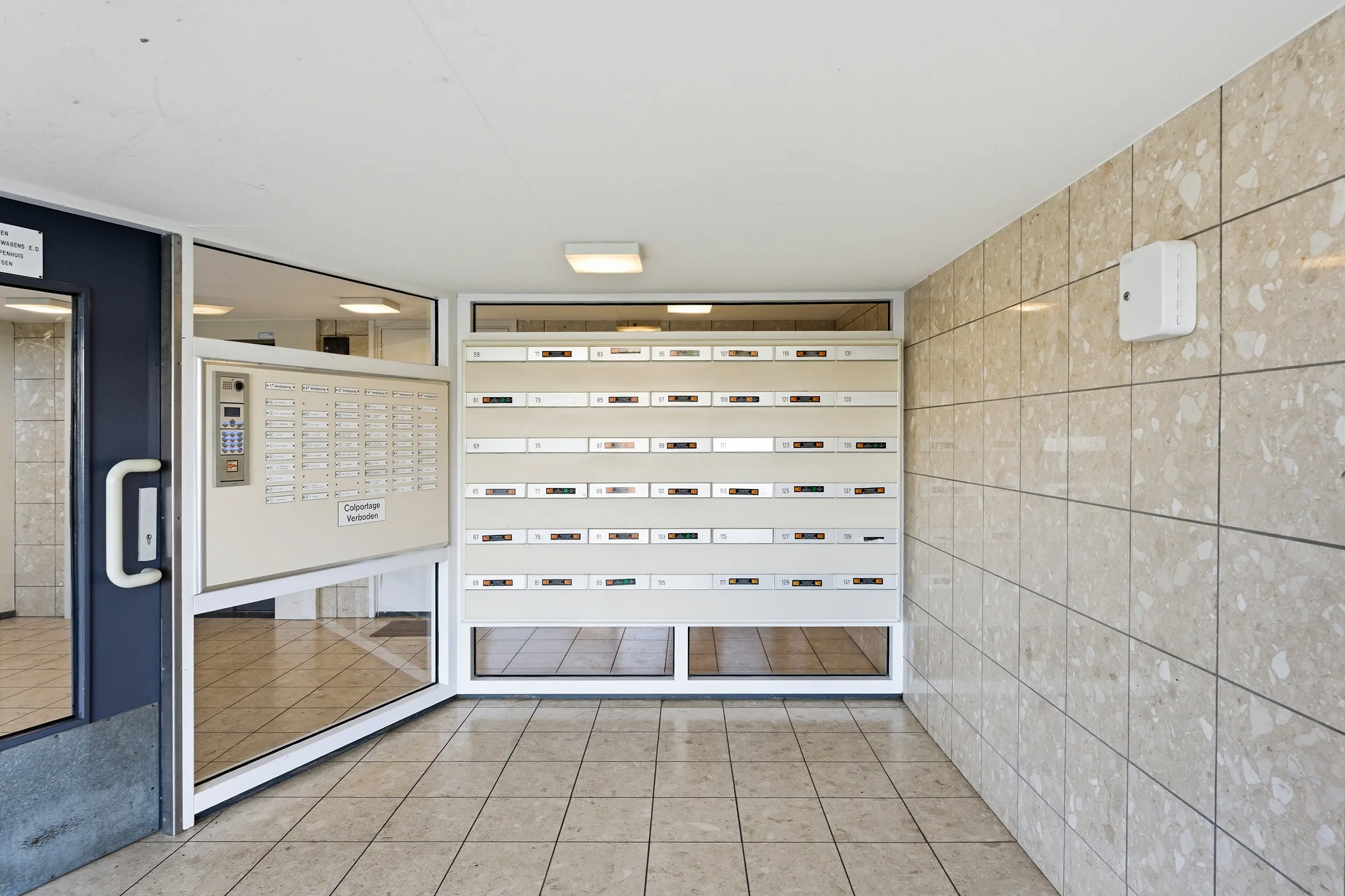 Centrale entree met de intercom en de brievenbussen, afgesloten hal met trappenhuis en liftinstallatie.