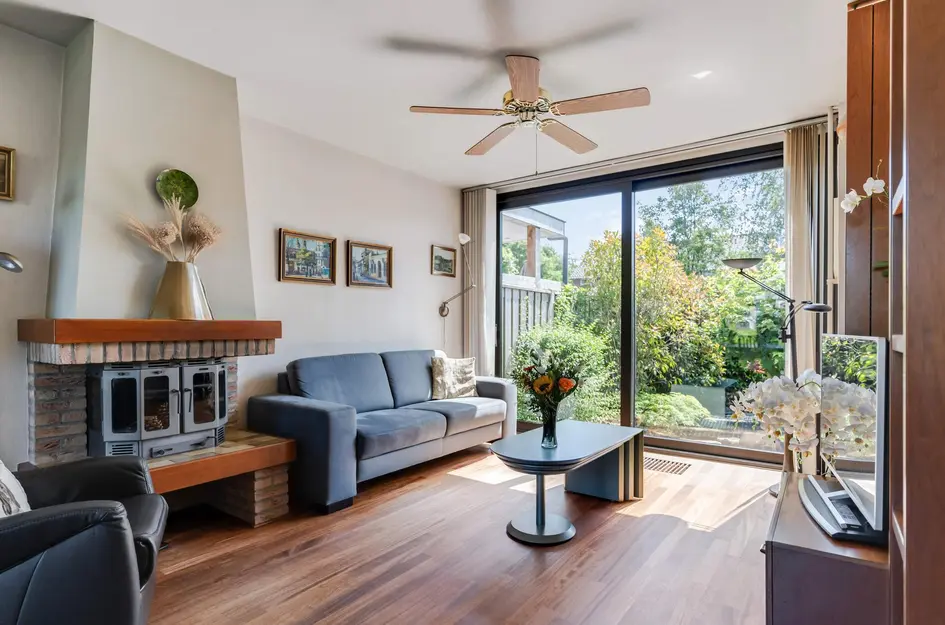 Afm. ca. 7,78 3,67m. Lichte doorzonwoonkamer met sfeervolle houtkachel, een strak afgewerkt plafond, een nette parketvloer en toegang tot de achtertuin middels de schuifpui. Aan de voorzijde geniet je van een weids uitzicht over de directe omgeving en aan de achterzijde wordt een vrij zicht geboden op de rijk aangeplante tuin.