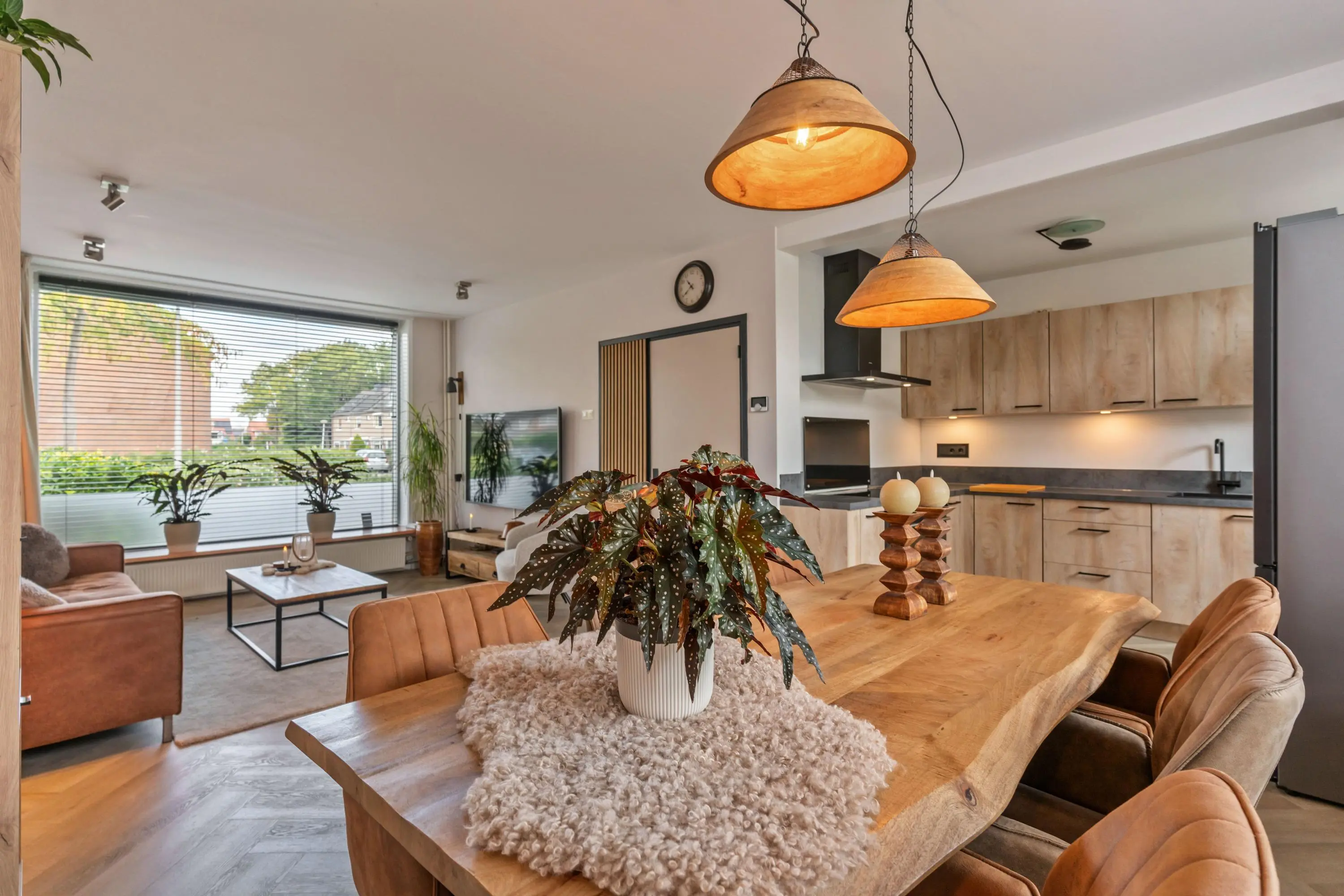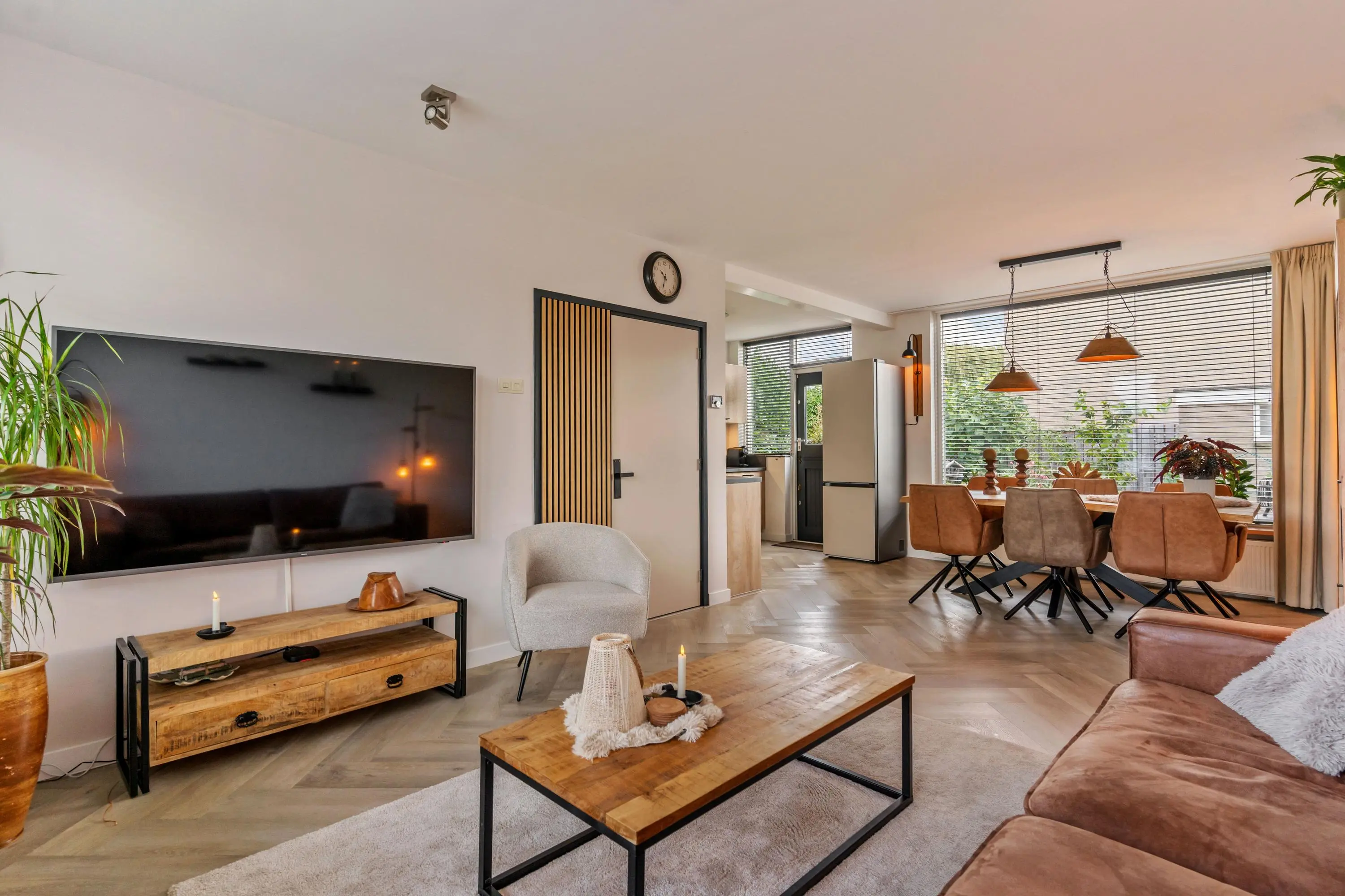 De royale en lichte woonkamer is ingedeeld met een zitgedeelte aan de voorzijde en een eetgedeelte aan de achterzijde, in directe verbinding met de keuken. Grote raampartijen aan beide zijden zorgen voor een prachtige lichtinval en een ruimtelijk gevoel.