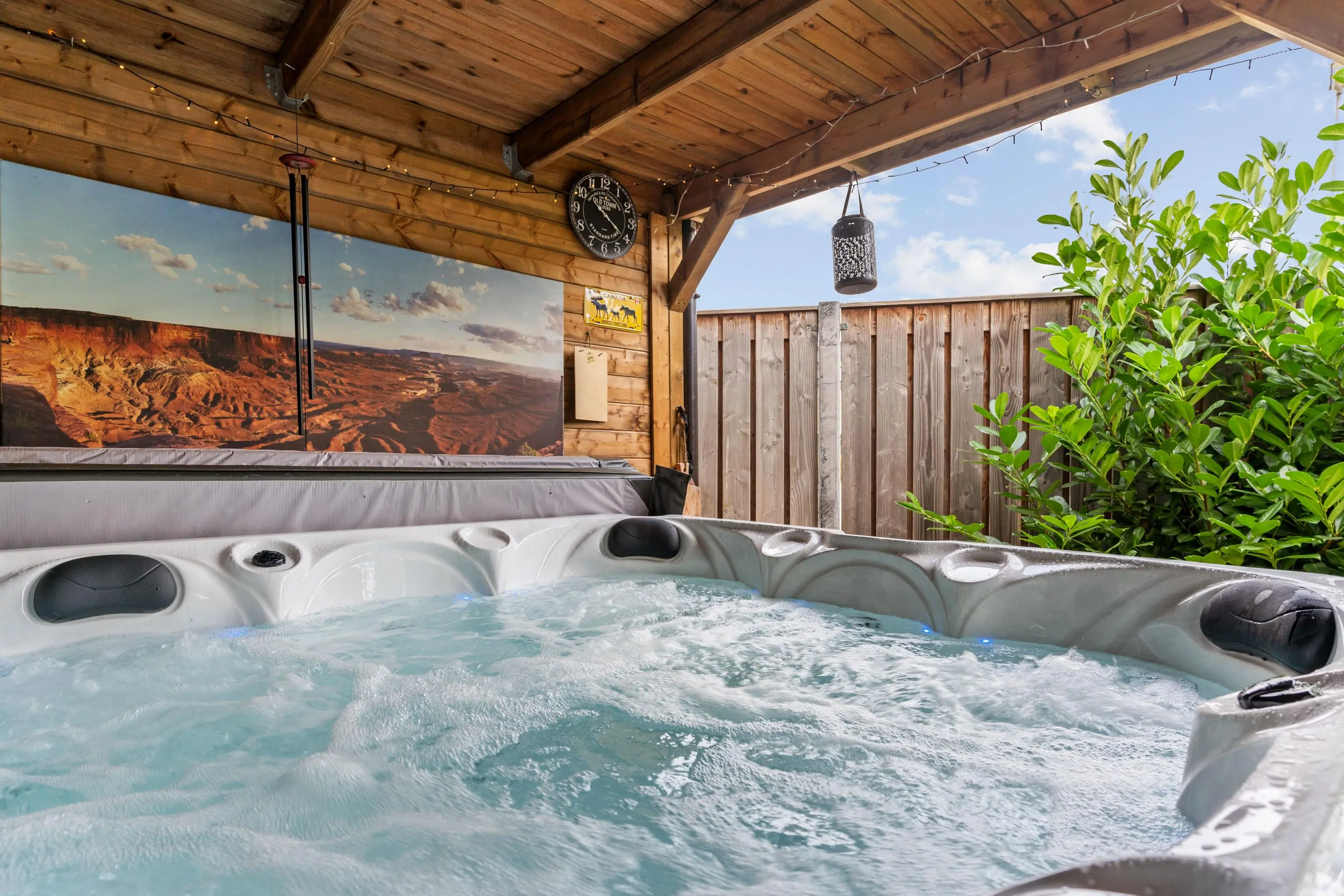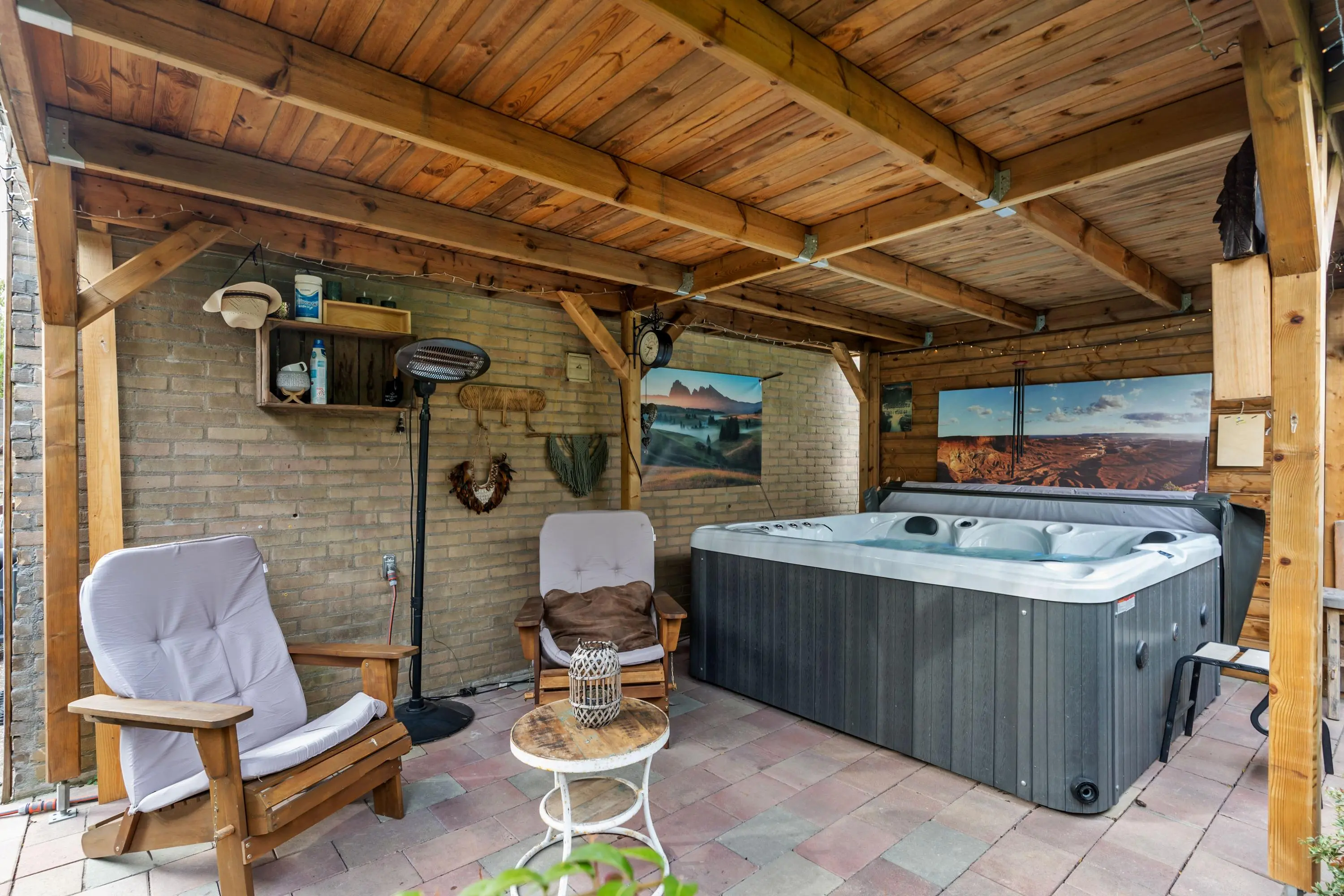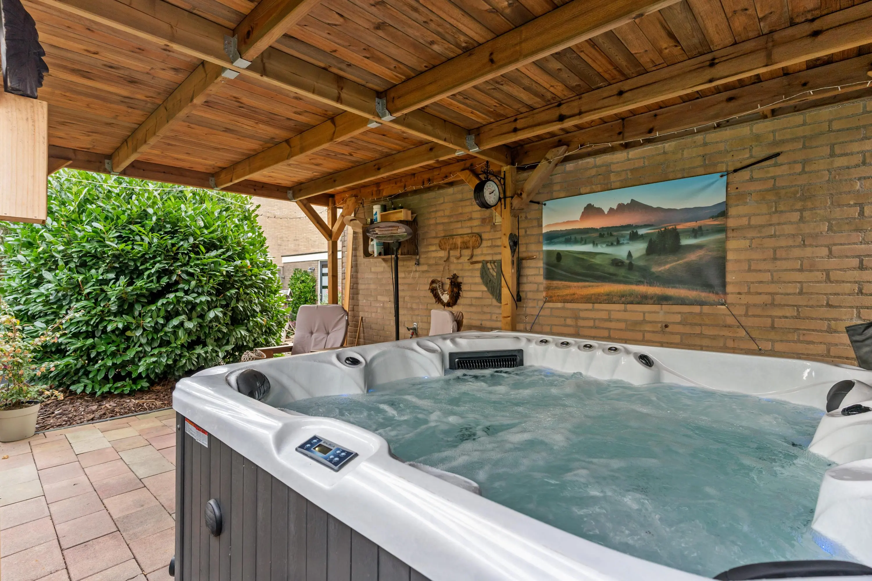 Een echte eyecatcher is de overkapping aan de zijkant van de woning. Hier geniet je in alle rust en privacy van lange zomeravonden. En het mooiste? De jacuzzi die in 2022 is geplaatst blijft achter. Hier kun je dus direct gaan ontspannen en genieten van het ultieme wellnessgevoel in je eigen tuin!