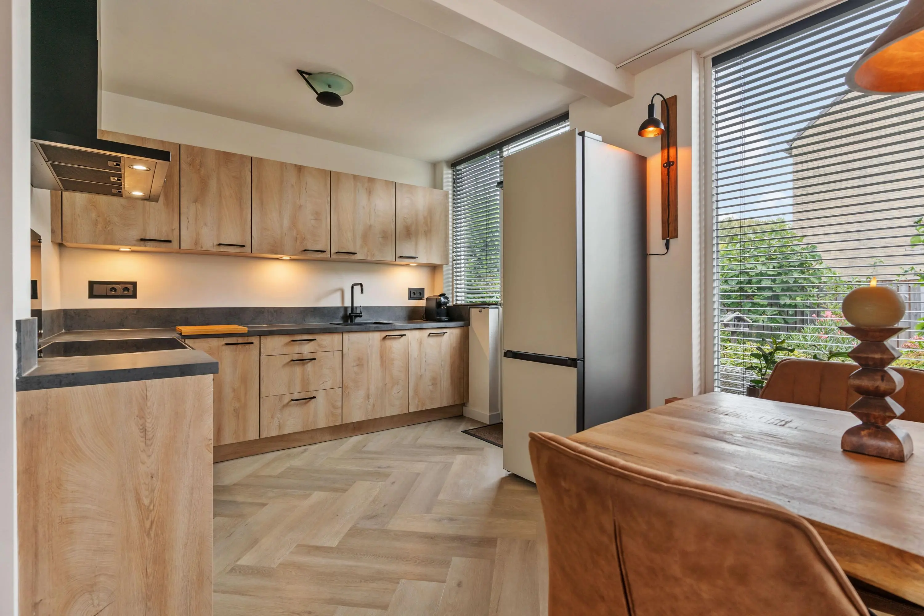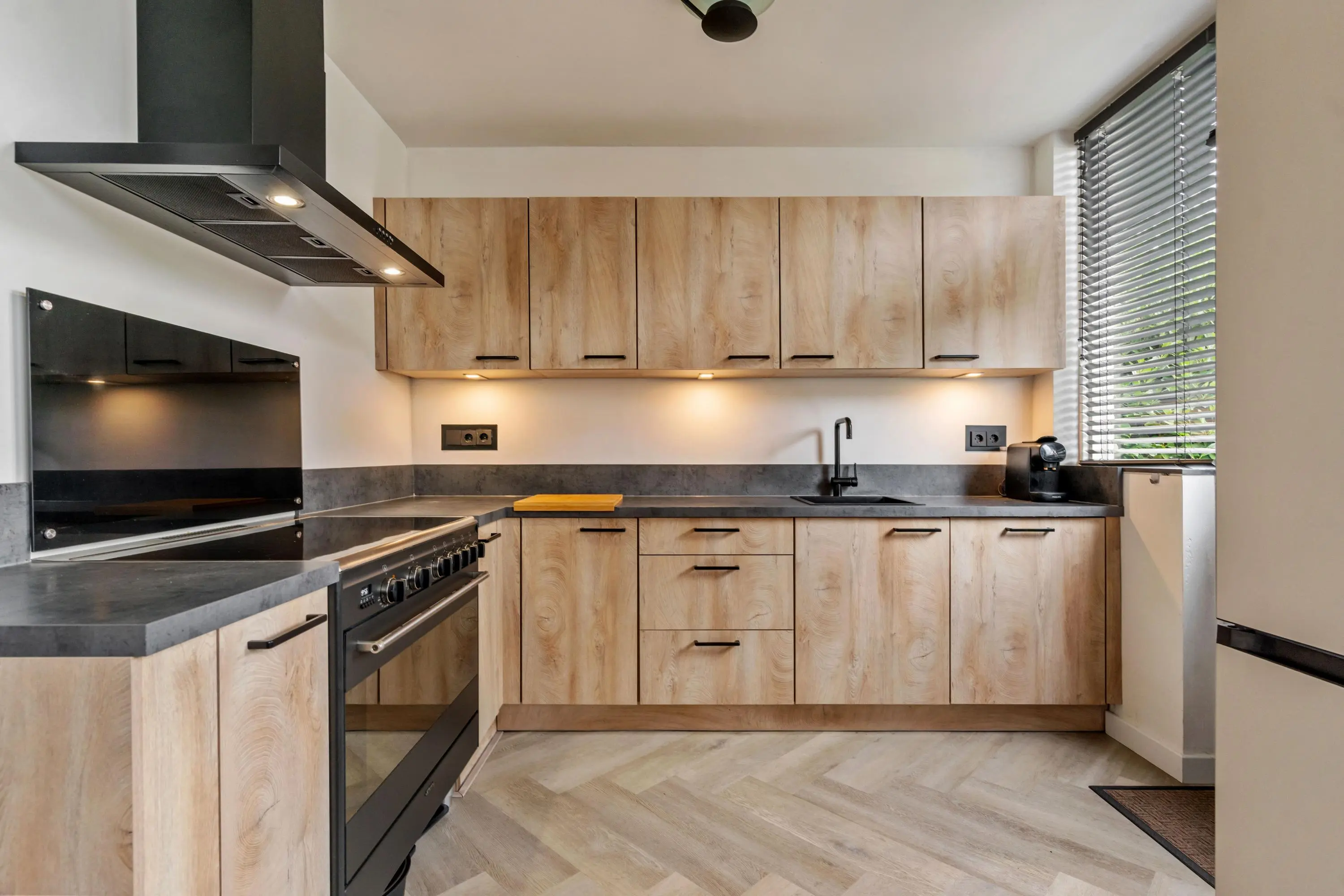 De luxe L-vormige keuken is afgewerkt met een contrasterend werkblad en beschikt over veel kastruimte. Uiteraard compleet met moderne inbouwapparatuur: inductiekookplaat, oven, vaatwasser en afzuigkap. Vanuit de keuken is er direct toegang tot de tuin.