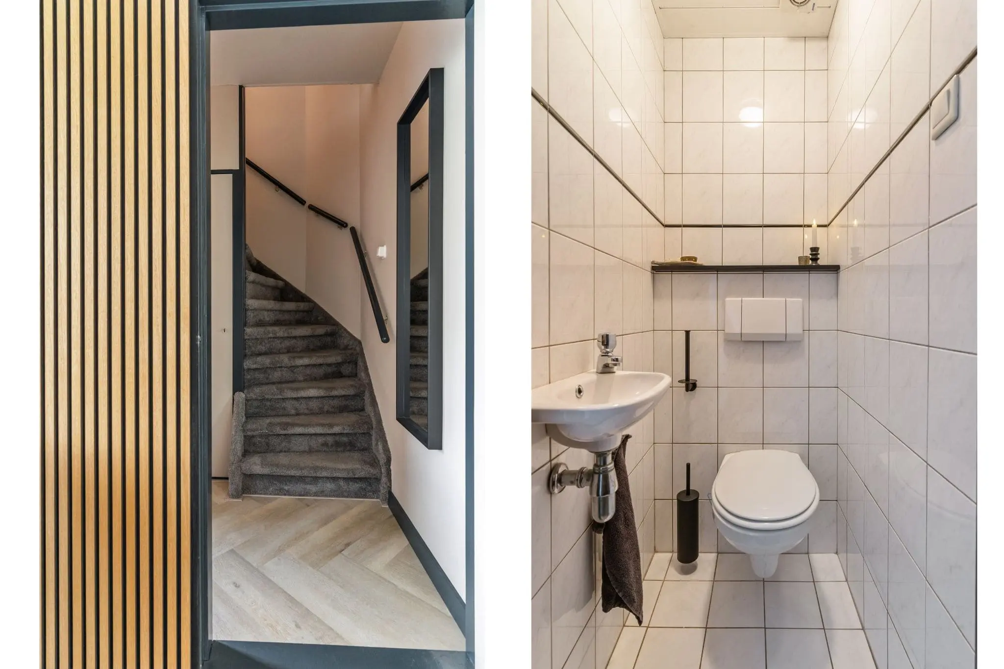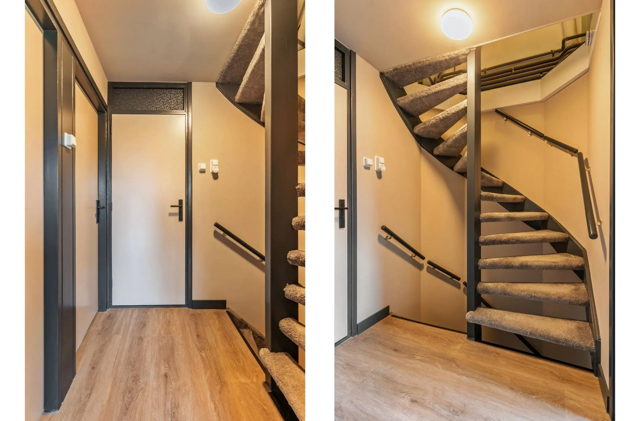 Ruime ontvangsthal met trapopgang, de vernieuwde meterkast (2024), toegang tot de toiletruimte en de woonkamer.