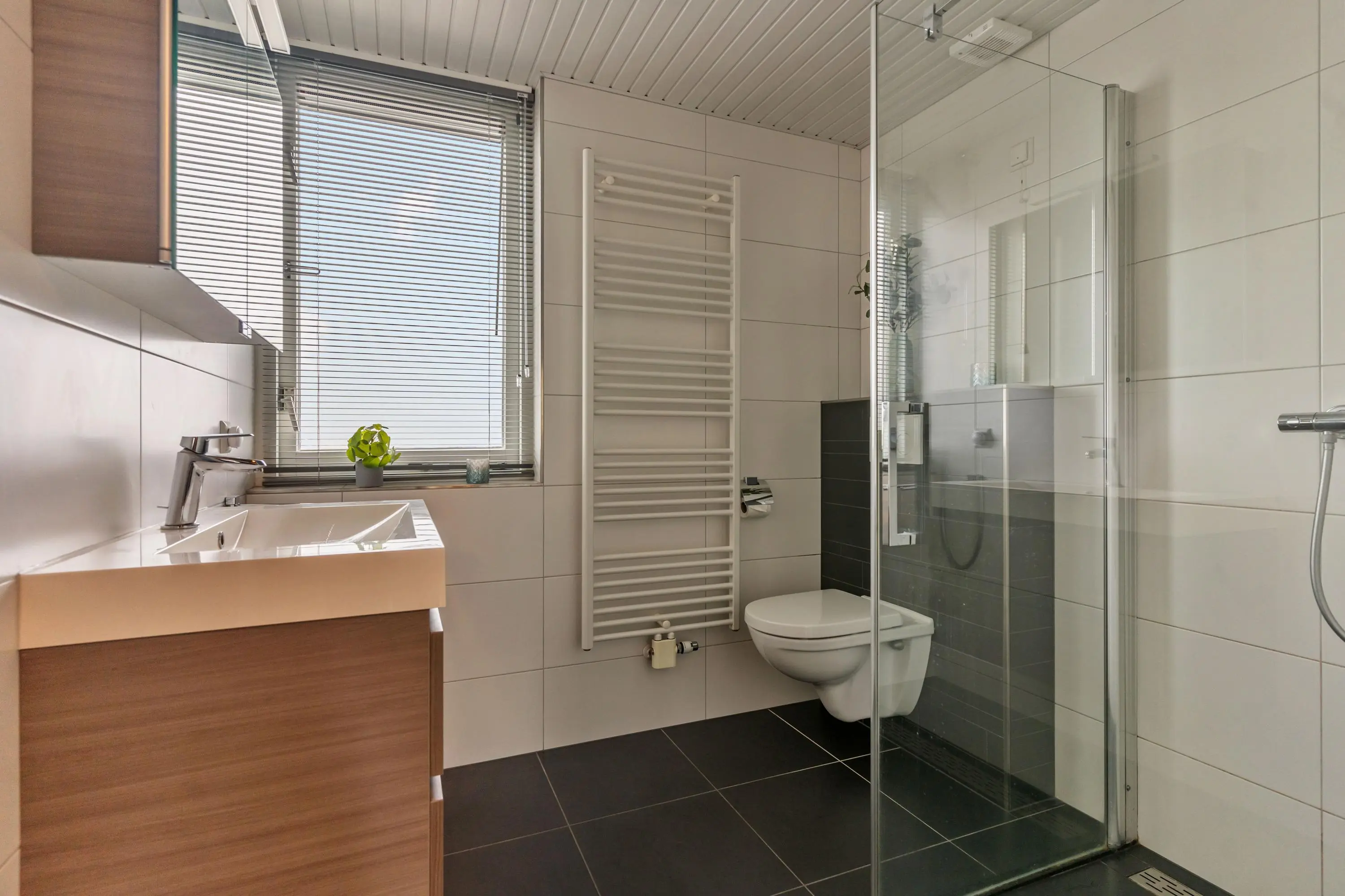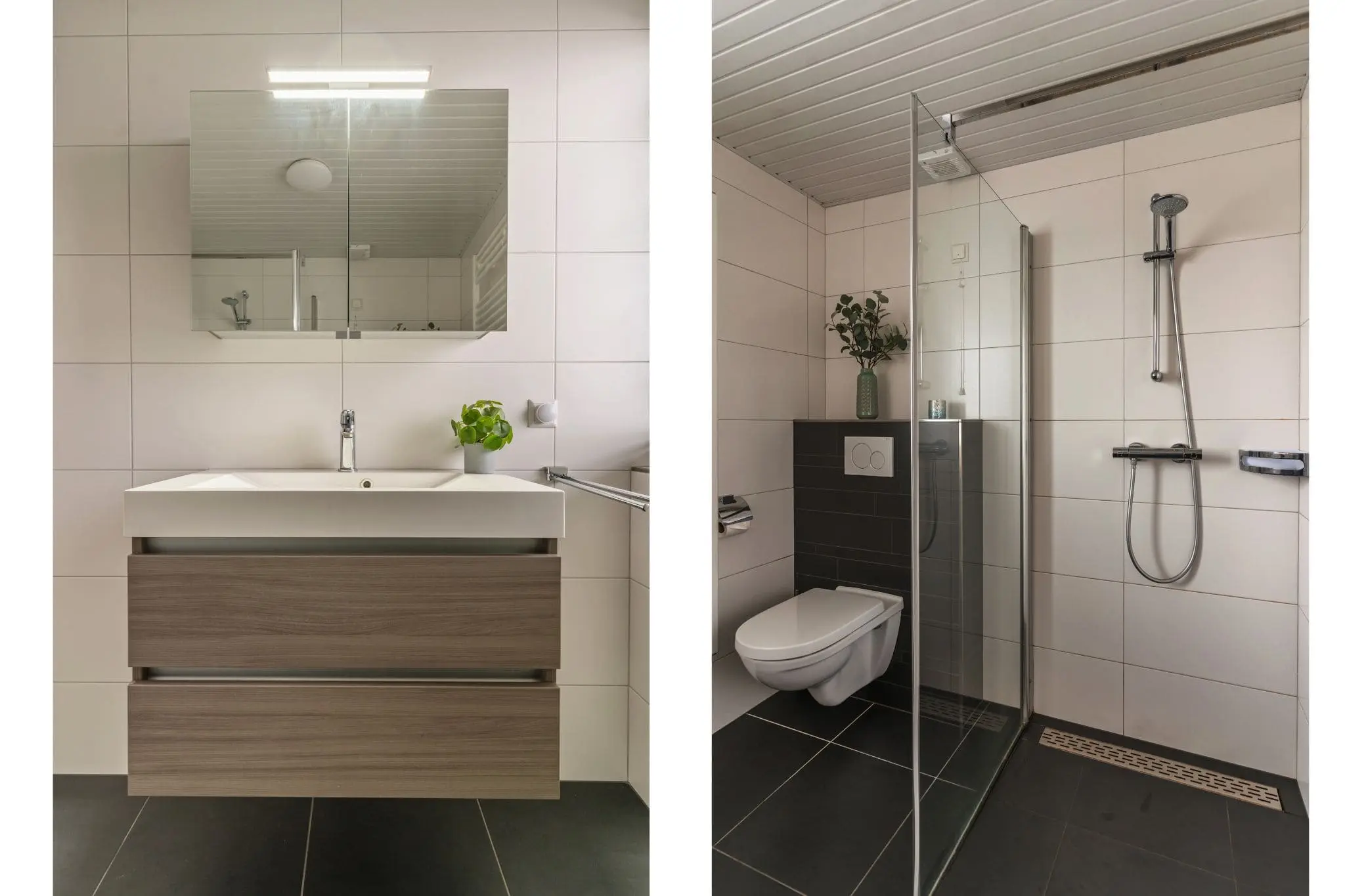 Modern en praktisch ingericht. Geheel betegeld en uitgerust met een inloopdouche met glazen douchewand en drain, een wastafelmeubel en een wandcloset.